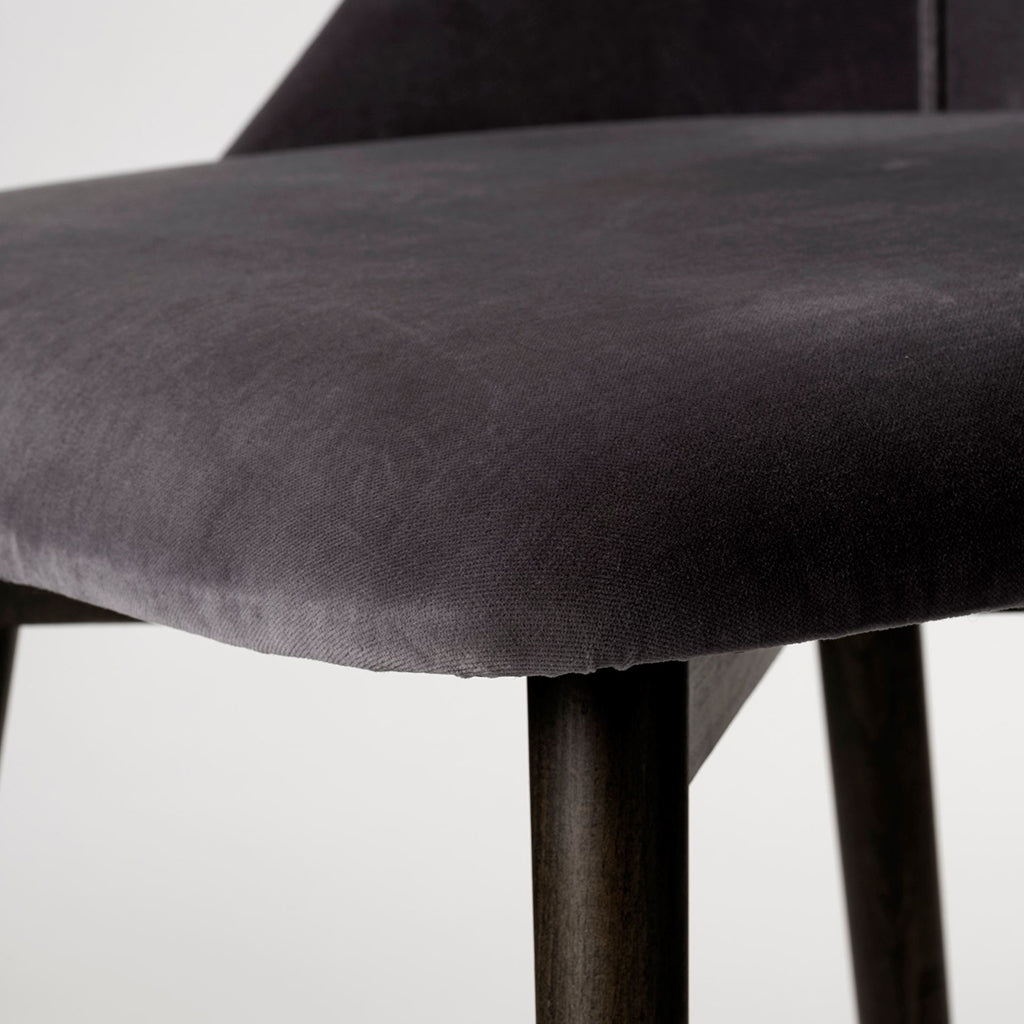 This dining chair, wrapped in plush grey-toned velvet, makes for a comfortable as well as a visually enticing addition to any dining room.