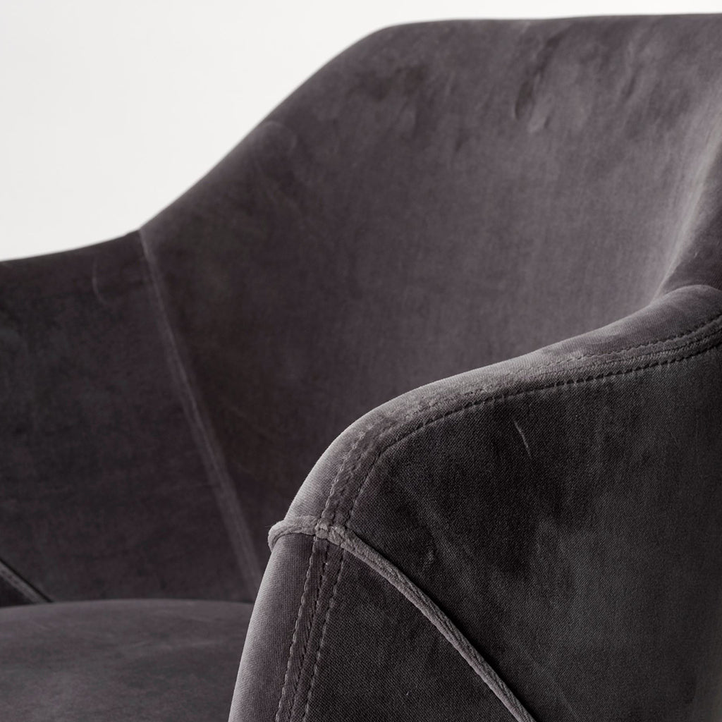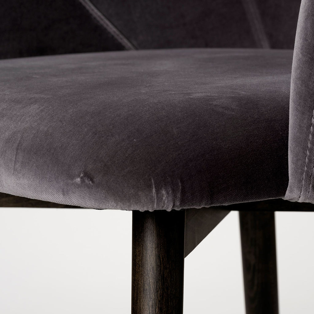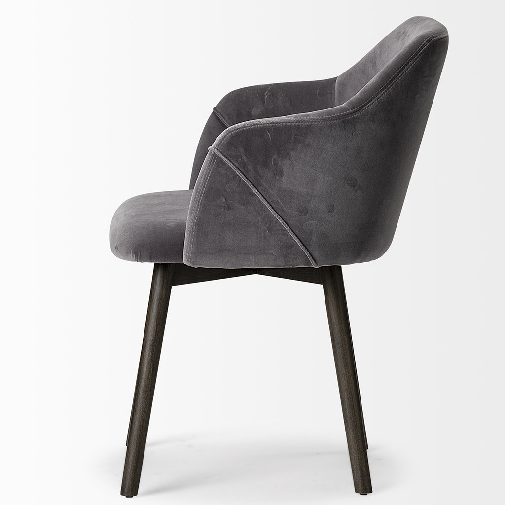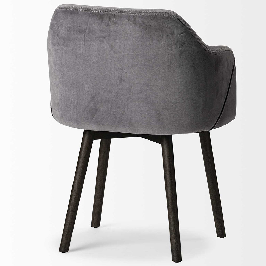 This dining chair, wrapped in plush grey-toned velvet, makes for a comfortable as well as a visually enticing addition to any dining room.