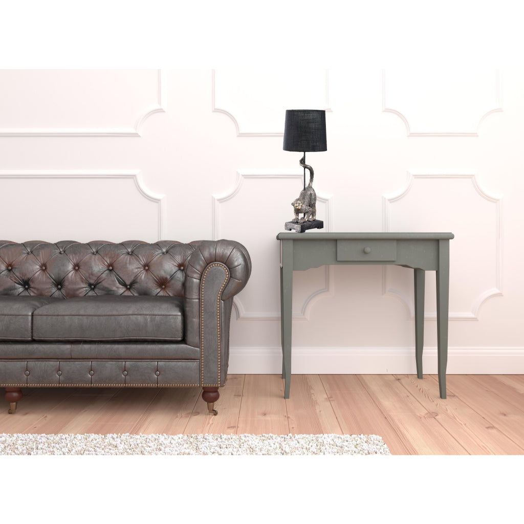 Features a slip uno shade fitter to attach the black semi-drum shade to the lamp base.