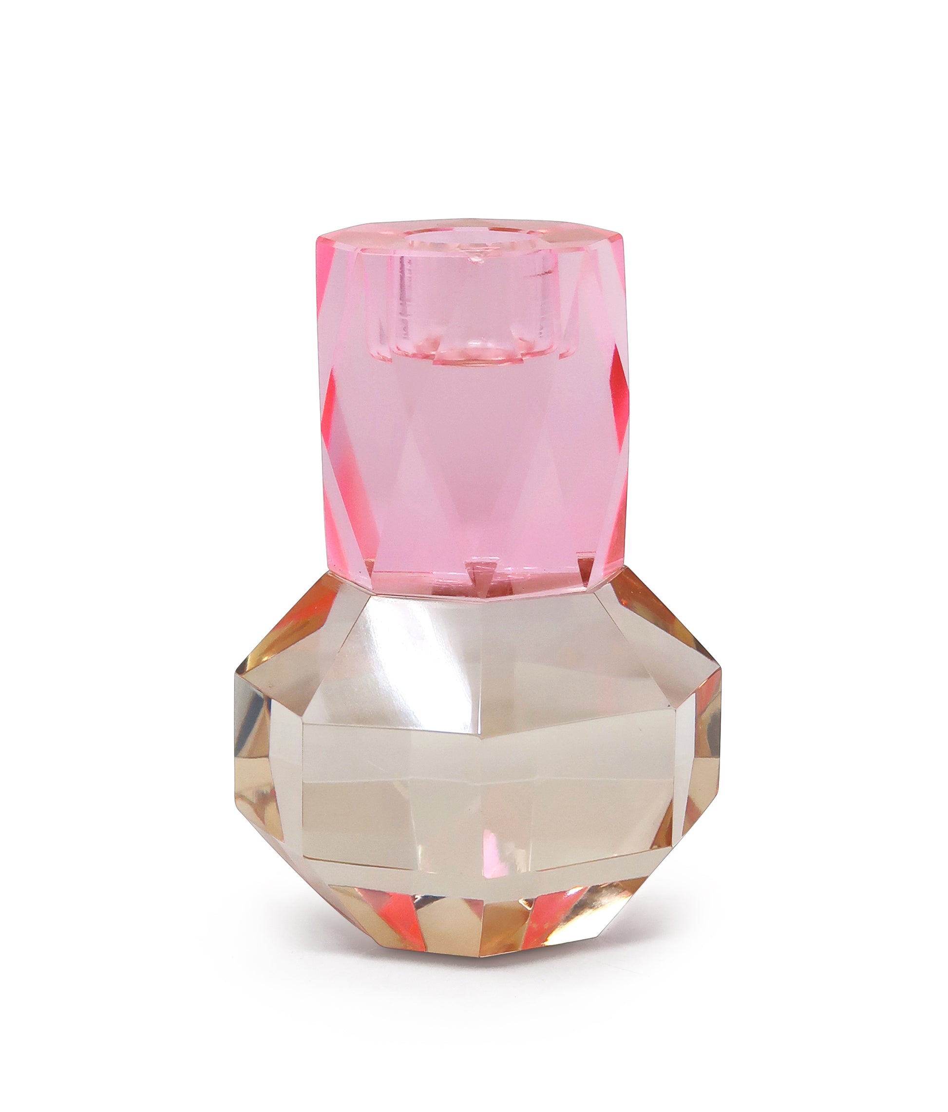 This 5-inch pink and clear crystal tabletop taper candlestick is a great addition to your home decor and sure to complement your existing furniture. Dress up your home to impress every season with this fabulous candleholder. Features a modern and contemporary optical crystal layered short stack geometric block design in a chic clear and pink color combination 4.75-inch h x 3-inch w x 3-inch d.
