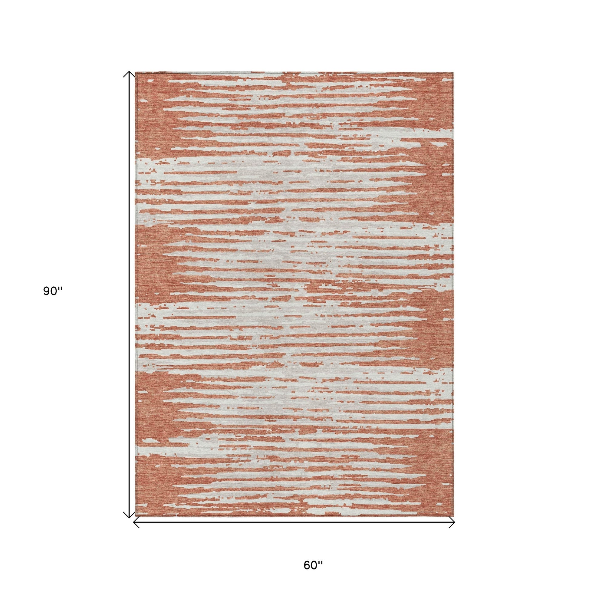 Add some artistry to your room with this 5-foot x 8-foot coral and ivory striped washable indoor outdoor area rug. This rectangle shaped rug features a striped design that will work well both indoors or out. A classic shape marries with good looking design for your living room, hall, bedroom, porch, patio, or poolside. Ideal for outdoor spaces or high traffic areas with kids and pets, this rug is made from heavy duty polyester that is stain resistant to help repel water, dirt, and stains. Versatile in use, durable, and easy to maintain, this rug is an ideal solution to add a decorative and inviting touch to your indoor or outdoor space. 60-inch h x 90-inch w x 0.19-inch d.