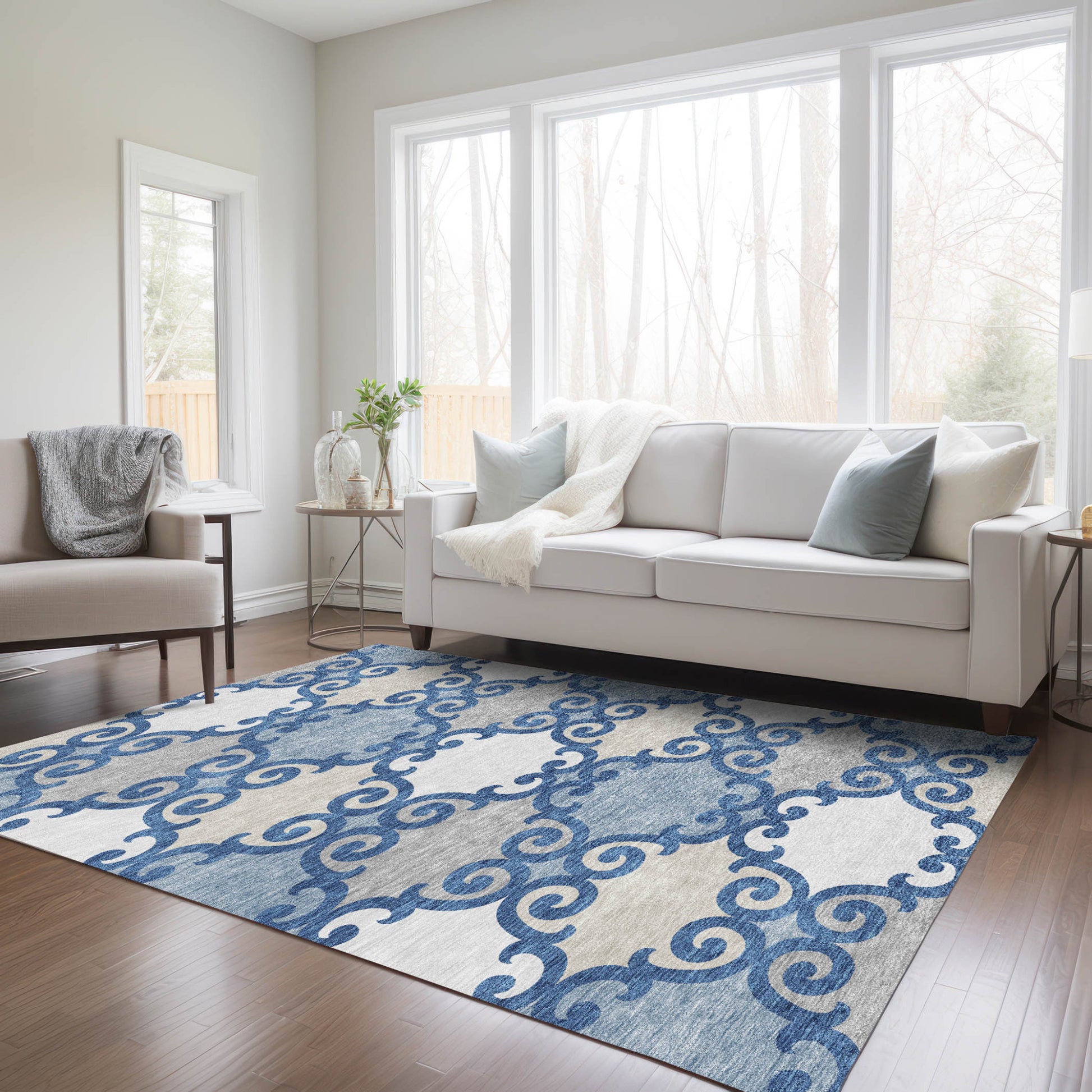 Add some artistry to your room with this 5-foot x 8-foot navy blue gray and ivory trellis washable indoor outdoor area rug. This rectangle shaped rug features a trellis design that will work well both indoors or out. A classic shape marries with good looking design for your living room, hall, bedroom, porch, patio, or poolside. Ideal for outdoor spaces or high traffic areas with kids and pets, this rug is made from heavy duty polyester that is stain resistant to help repel water, dirt, and stains. Makes a great way to dress up your patio, porch, or poolside, but also works well as a durable and easy to maintain option in the kitchen, family room, or mudroom. 60-inch h x 90-inch w x 0.19-inch d.