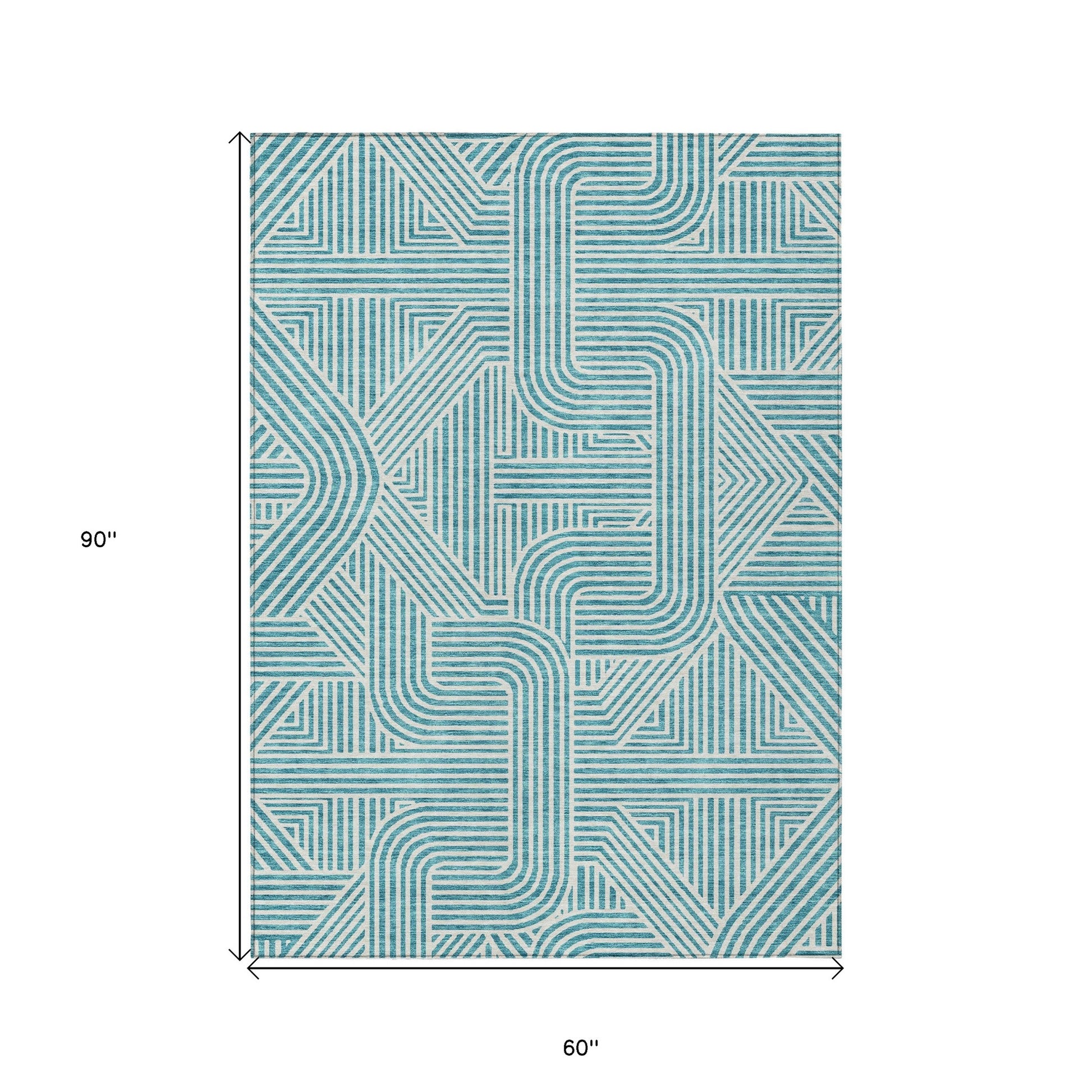 Tabselect Home Line 5' X 8' Teal Blue And Ivory Abstract Washable Indoor Outdoor Area Rug