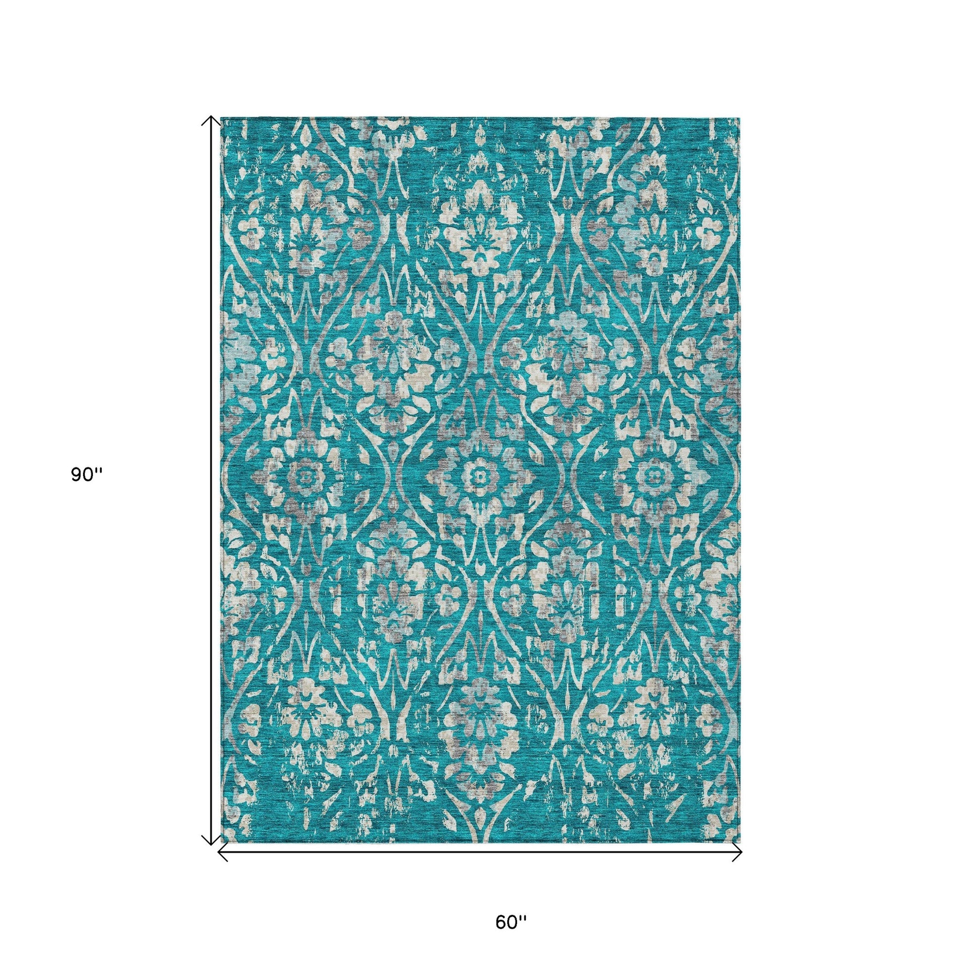 Tabselect Home Line 5' X 8' Teal Blue And Ivory Floral Washable Indoor Outdoor Area Rug