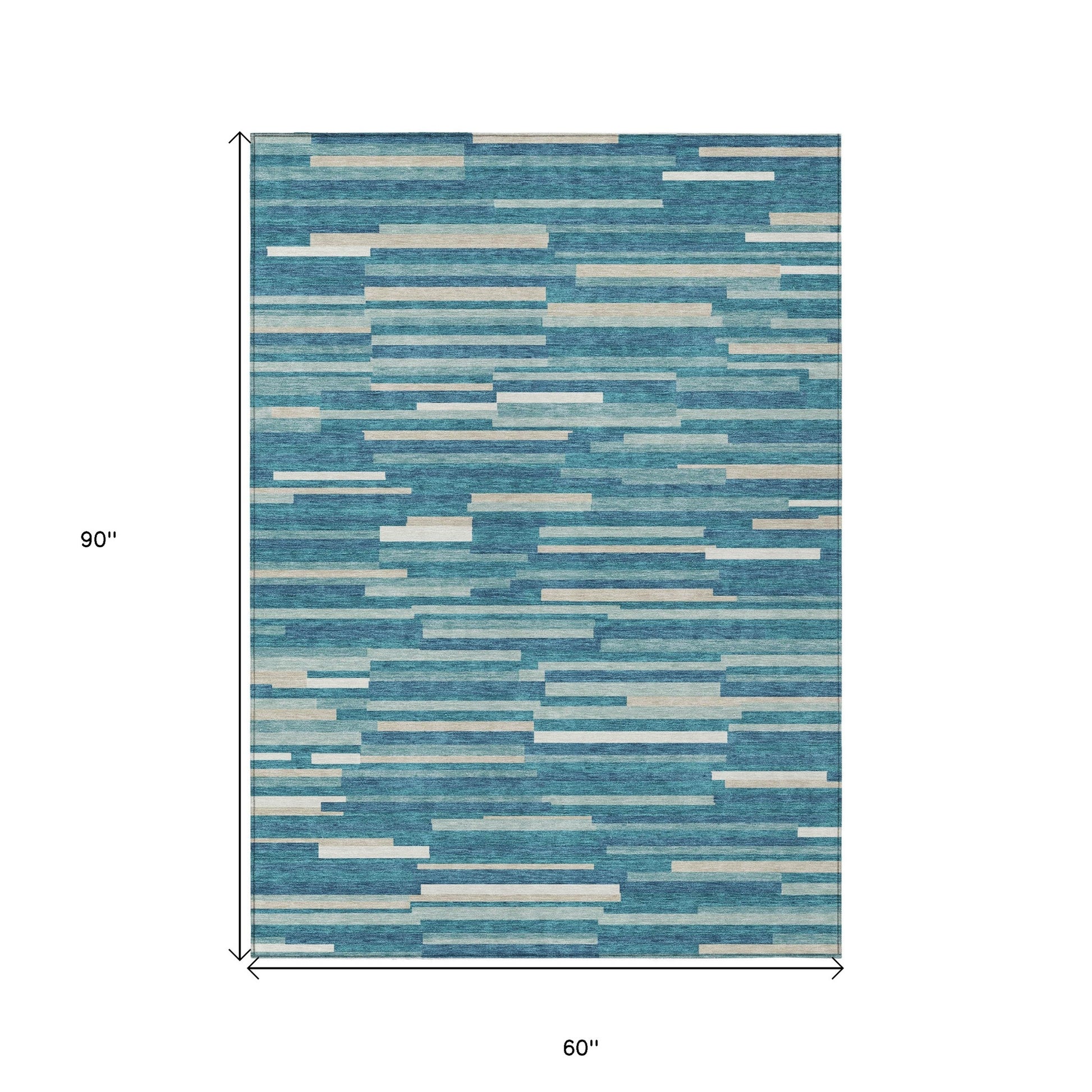 Tabselect Home Line 5' X 8' Teal Blue And Ivory Striped Washable Indoor Outdoor Area Rug