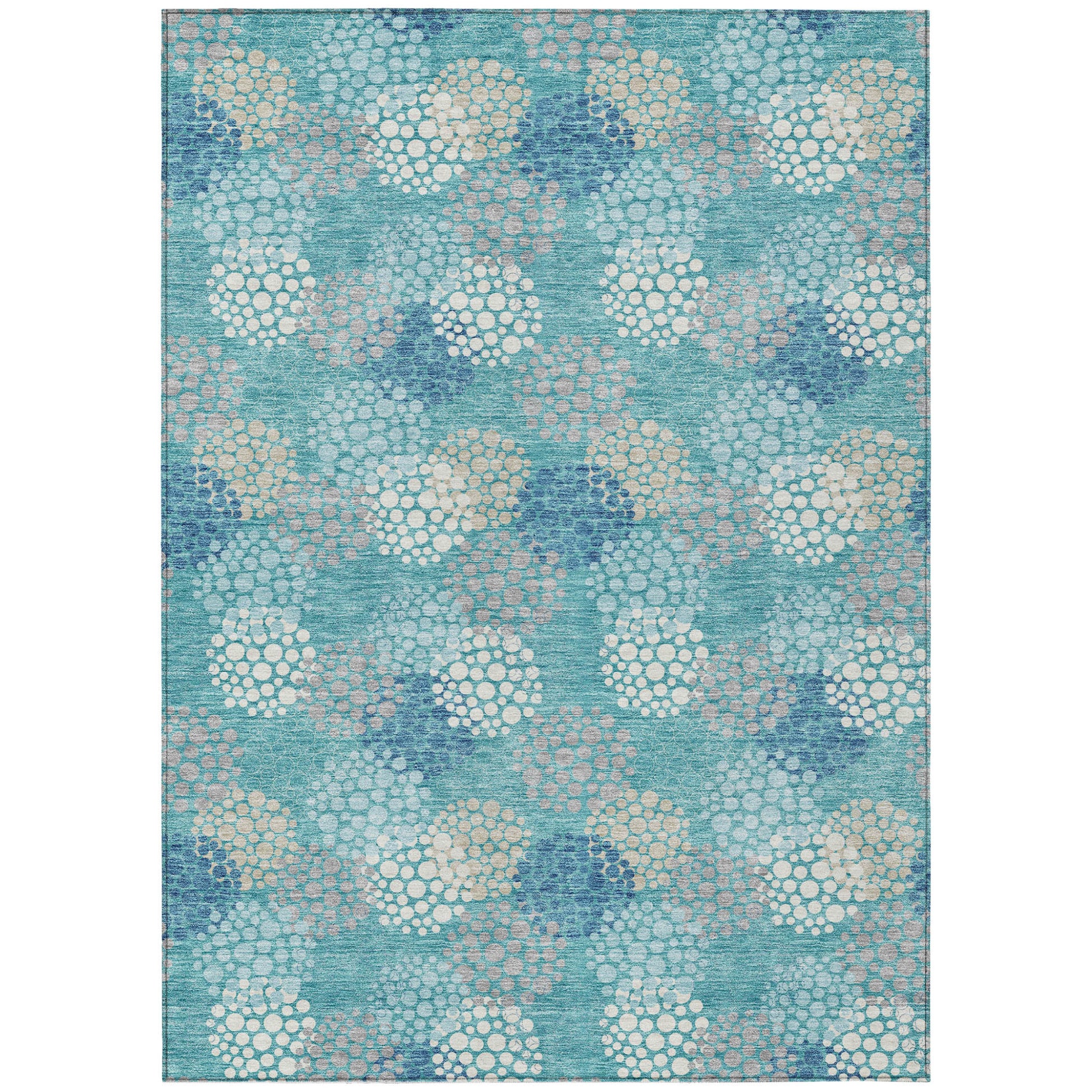 Set an inviting tone in your space with this 5-foot x 8-foot teal blue gray and ivory polka dot washable indoor outdoor area rug. This rectangle shaped rug features a polka dot design that will work well both indoors or out. A classic shape marries with good looking design for your living room, hall, bedroom, porch, patio, or poolside. Ideal for outdoor spaces or high traffic areas with kids and pets, this rug is made from heavy duty polyester that is stain resistant to help repel water, dirt, and stains. Versatile in use, durable, and easy to maintain, this rug is an ideal solution to add a decorative and inviting touch to your indoor or outdoor space. 60-inch h x 90-inch w x 0.19-inch d.