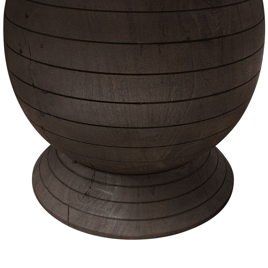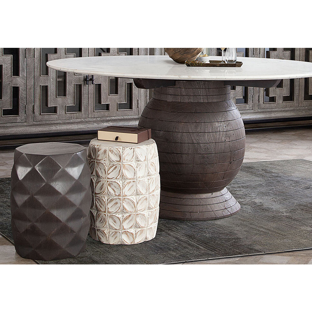 The genuine white marble slab tops the sculptural carved radial solid acacia wood base in contrasting espresso finish providing a unifying symmetry.