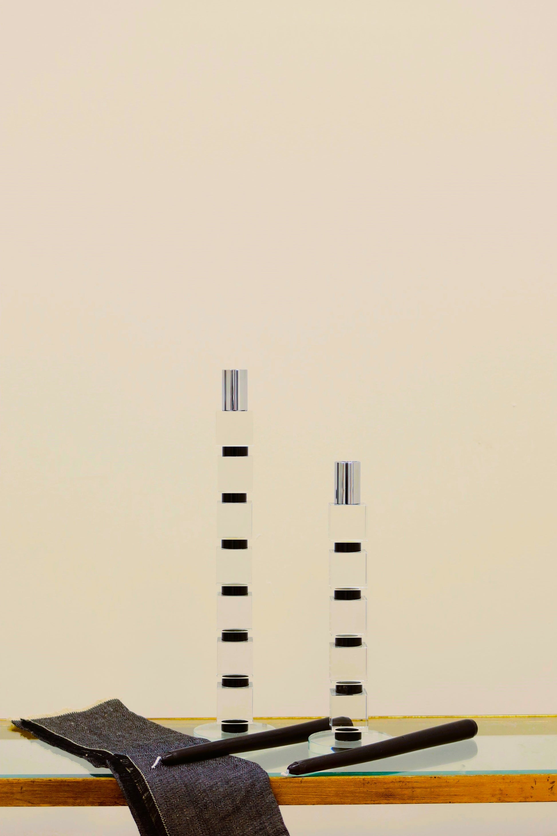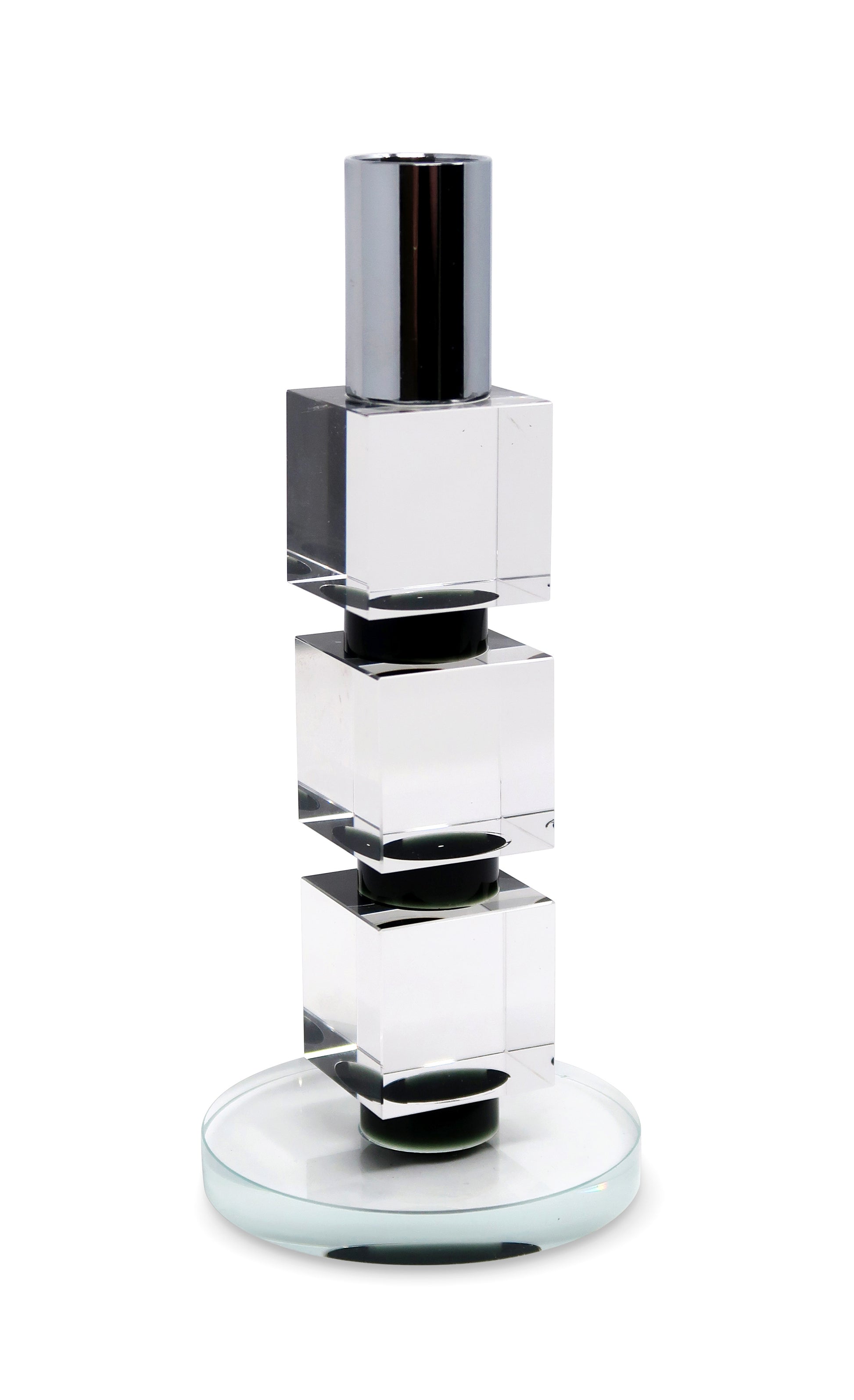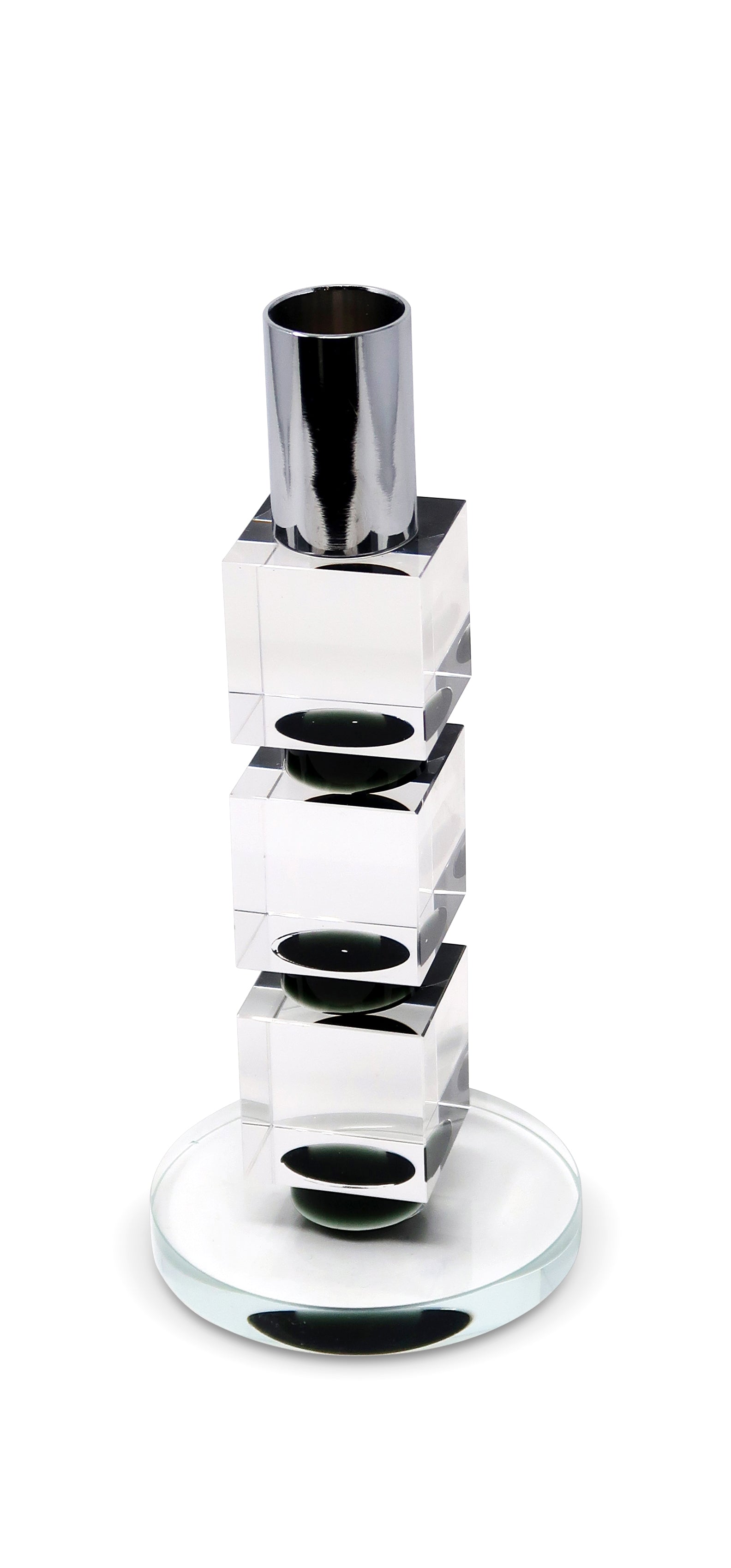 Tabselect Home Line 7" Silver Clear And Black Block And Cylinder Crystal Tabletop Taper Candlestick