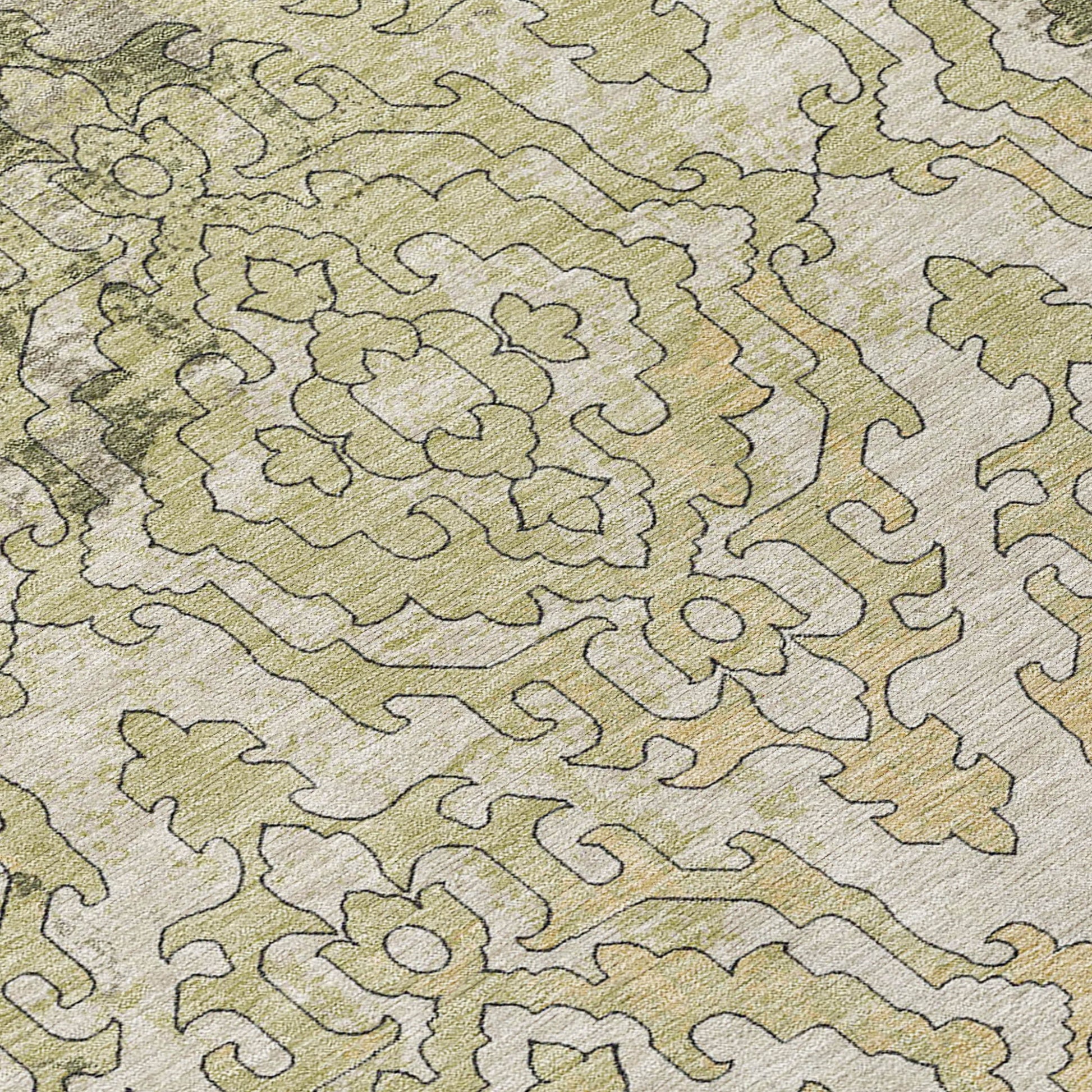 Add great coloration and comfortable texture to your space with this 8-foot artichoke green and beige round medallion washable indoor outdoor area rug. This geometric round shaped rug features a medallion pattern in artichoke green and beige that combines a good looking print with a unique and updated shape. The mix of shape, color, and design gives this rug refreshing visual interest. Ideal for outdoor spaces or high traffic areas with kids and pets, this rug is made from heavy duty polyester that is stain resistant to help repel water, dirt, and stains. Versatile in use, durable, and easy to maintain, this rug is an ideal solution to add a decorative and inviting touch to your indoor or outdoor space. 96-inch h x 96-inch w x 0.19-inch d.