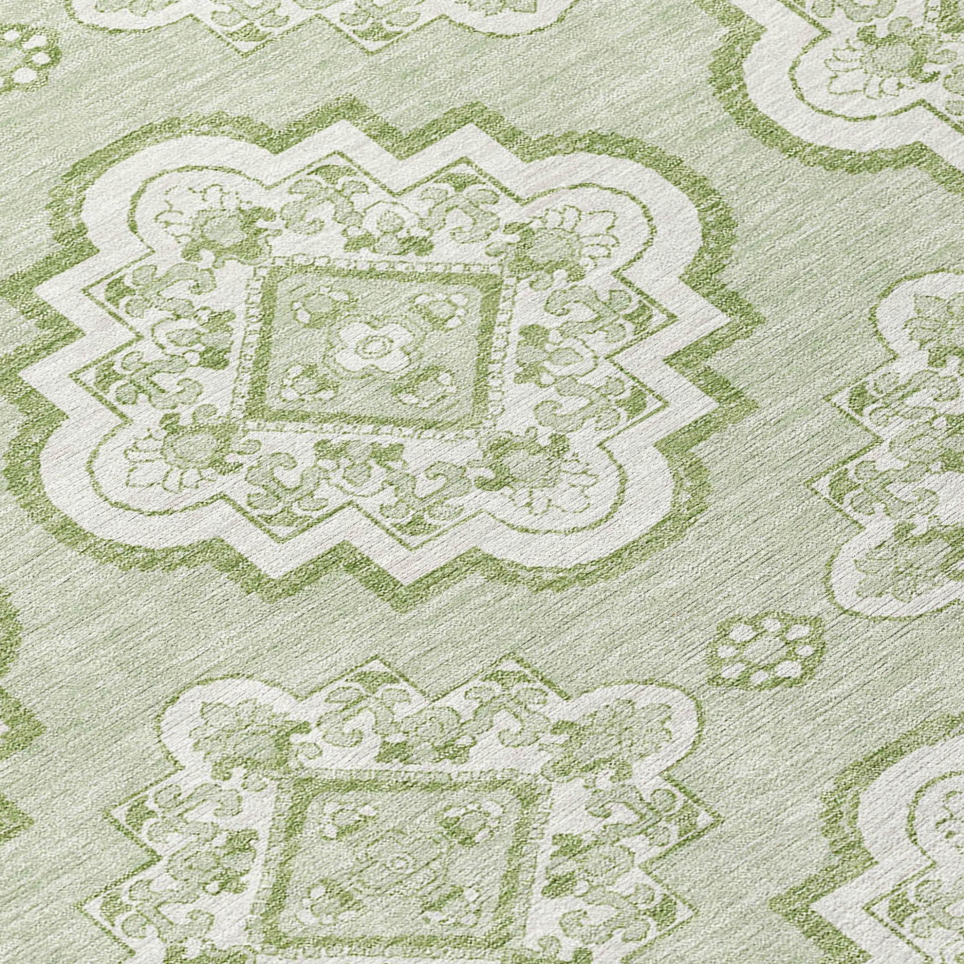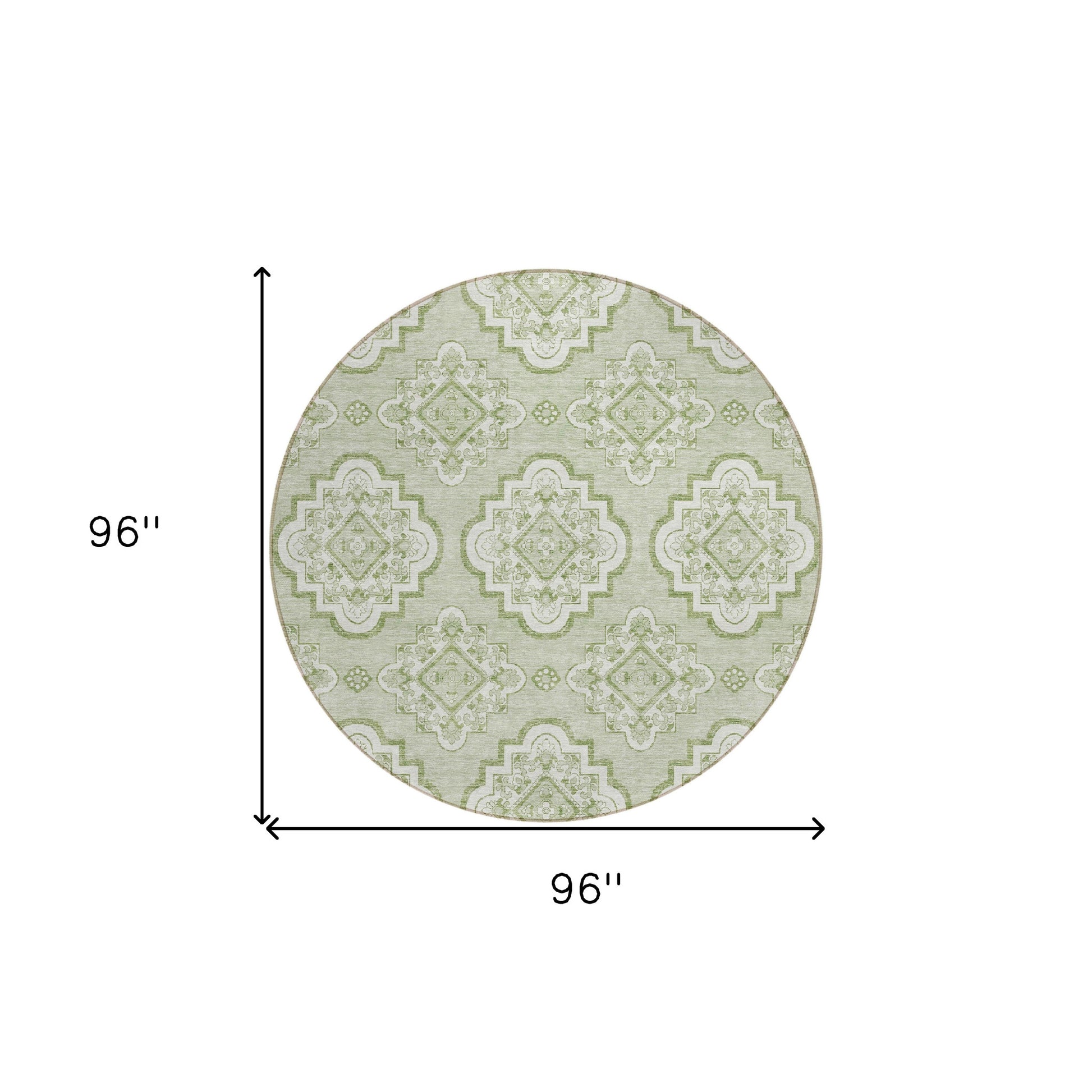 Add some artistry to your room with this 8-foot artichoke green and ivory round medallion washable indoor outdoor area rug. This geometric round shaped rug features a medallion pattern in artichoke green and ivory that combines a good looking print with a unique and updated shape. The mix of shape, color, and design gives this rug refreshing visual interest. Ideal for outdoor spaces or high traffic areas with kids and pets, this rug is made from heavy duty polyester that is stain resistant to help repel water, dirt, and stains. Versatile in use, durable, and easy to maintain, this rug is an ideal solution to add a decorative and inviting touch to your indoor or outdoor space. 96-inch h x 96-inch w x 0.19-inch d.