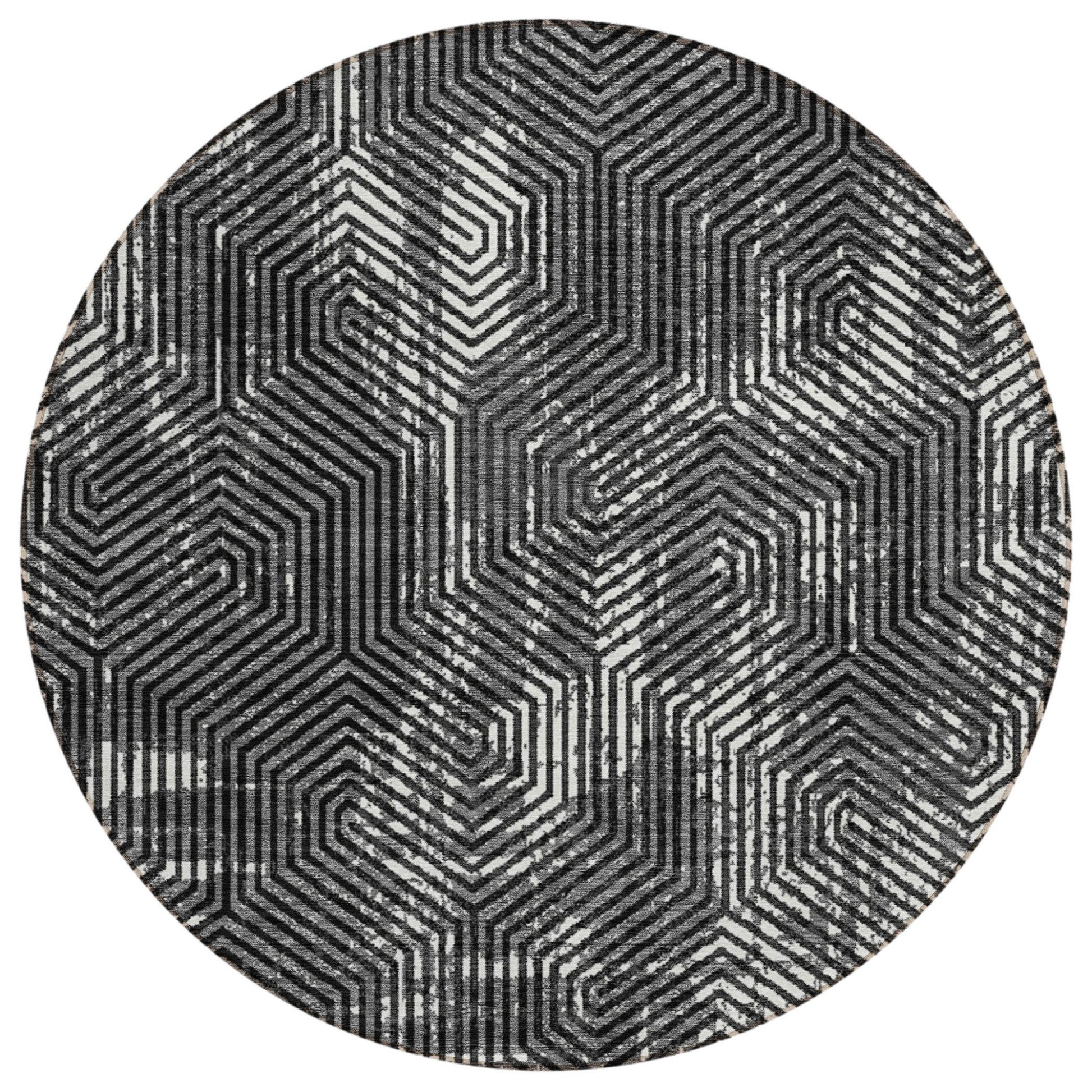 Tabselect Home Line 8' Black And Ivory Round Geometric Washable Indoor Outdoor Area Rug