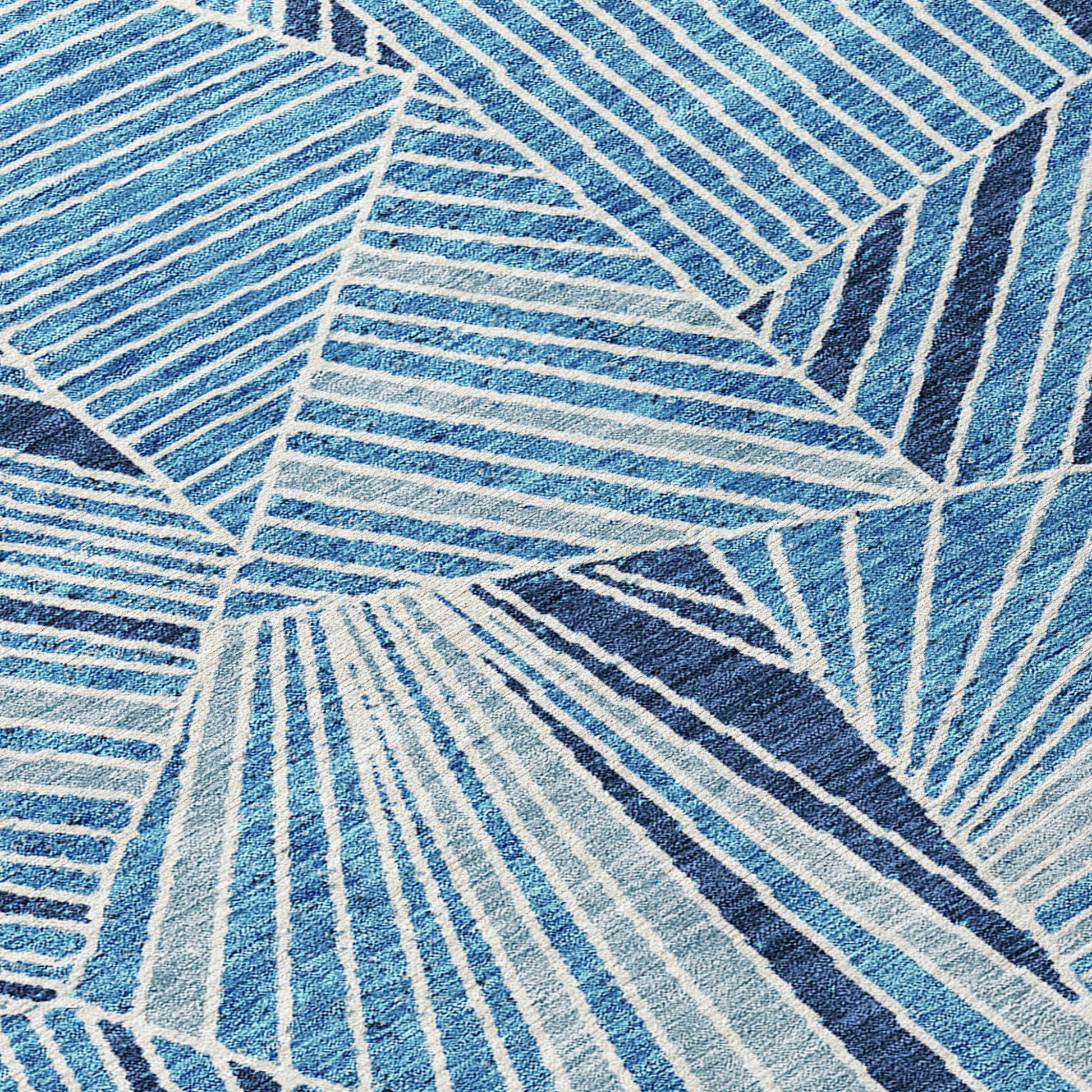 Add some artistry to your room with this 8-foot blue and teal blue round geometric washable indoor outdoor area rug. This geometric round shaped rug features a geometric pattern in blue and teal blue that combines a good looking print with a unique and updated shape. The mix of shape, color, and design gives this rug refreshing visual interest. Ideal for outdoor spaces or high traffic areas with kids and pets, this rug is made from heavy duty polyester that is stain resistant to help repel water, dirt, and stains. Versatile in use, durable, and easy to maintain, this rug is an ideal solution to add a decorative and inviting touch to your indoor or outdoor space. 96-inch h x 96-inch w x 0.19-inch d.