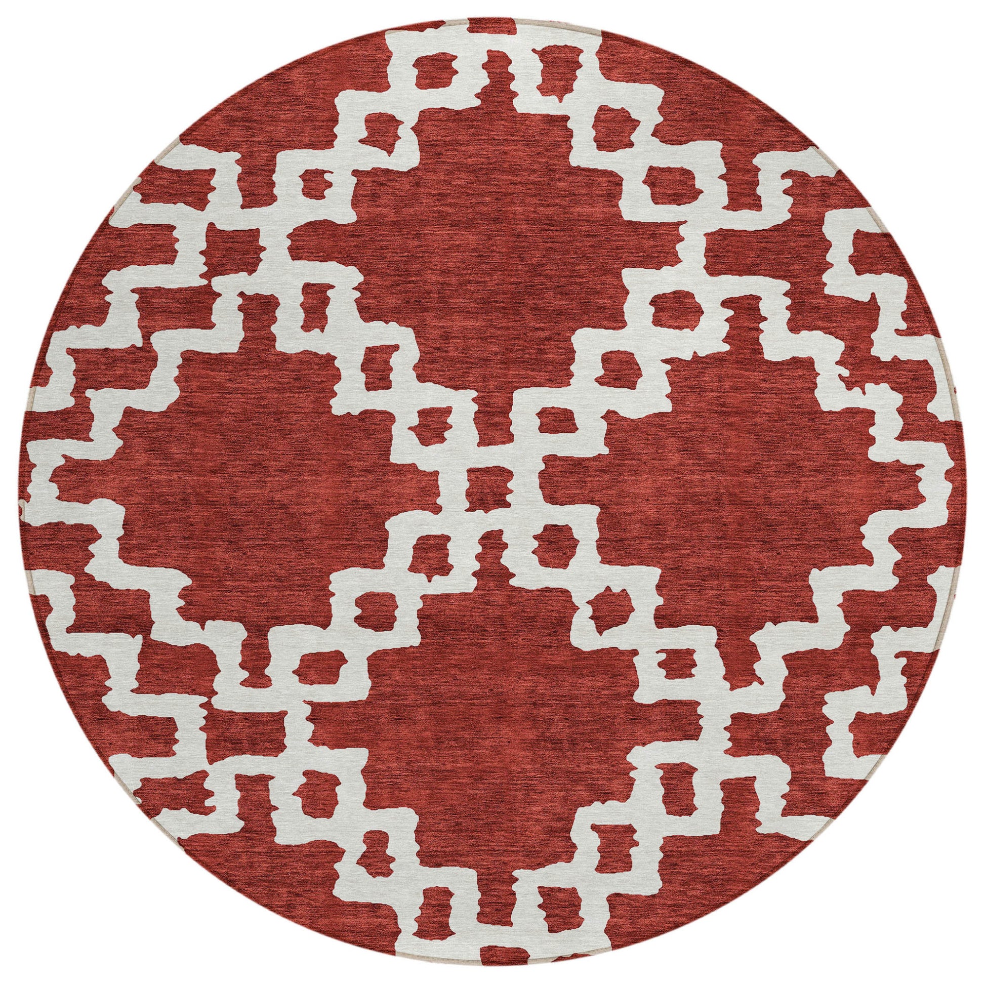 Add some artistry to your room with this 8-foot brick red and ivory round geometric washable indoor outdoor area rug. This geometric round shaped rug features a geometric pattern in brick red and ivory that combines a good looking print with a unique and updated shape. The mix of shape, color, and design gives this rug refreshing visual interest. Ideal for outdoor spaces or high traffic areas with kids and pets, this rug is made from heavy duty polyester that is stain resistant to help repel water, dirt, and stains. Makes a great way to dress up your patio, porch, or poolside, but also works well as a durable and easy to maintain option in the kitchen, family room, or mudroom. 96-inch h x 96-inch w x 0.19-inch d.