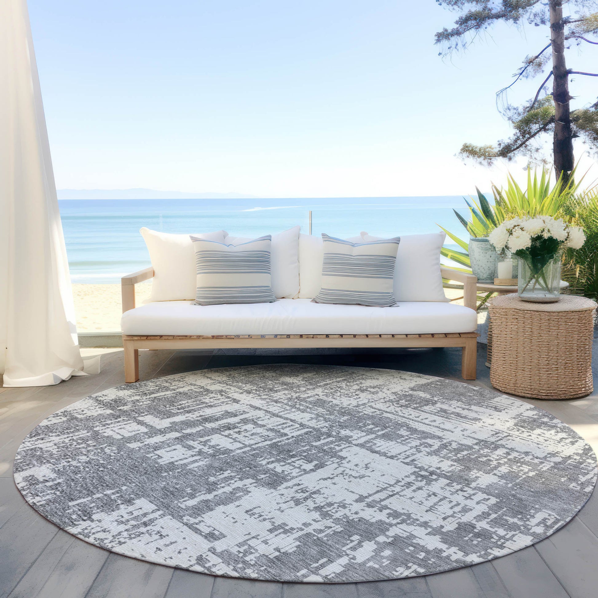 Set an inviting tone in your space with this 8-foot gray and ivory round abstract washable indoor outdoor area rug. This geometric round shaped rug features a abstract pattern in gray and ivory that combines a good looking print with a unique and updated shape. The mix of shape, color, and design gives this rug refreshing visual interest. Ideal for outdoor spaces or high traffic areas with kids and pets, this rug is made from heavy duty polyester that is stain resistant to help repel water, dirt, and stains. Makes a great way to dress up your patio, porch, or poolside, but also works well as a durable and easy to maintain option in the kitchen, family room, or mudroom. 96-inch h x 96-inch w x 0.19-inch d.