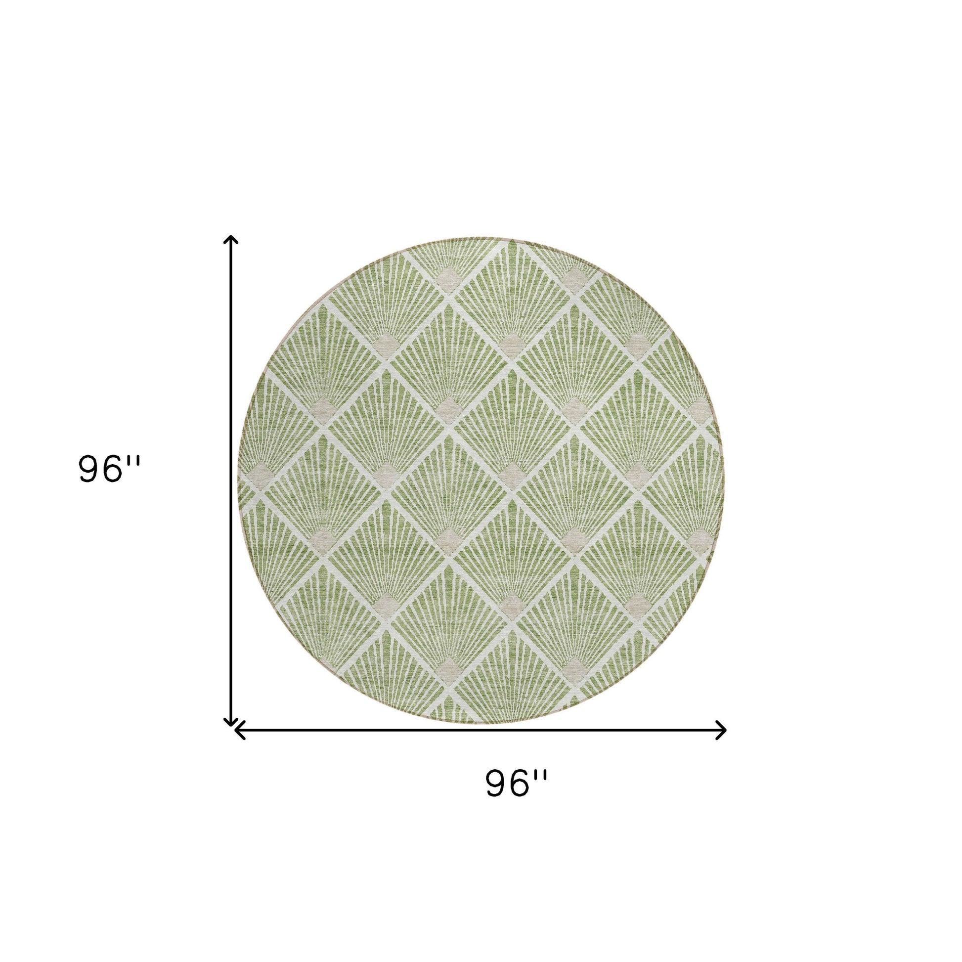 Set an inviting tone in your space with this 8-foot green beige and ivory round geometric washable indoor outdoor area rug. This geometric round shaped rug features a geometric pattern in green, beige, and ivory that combines a good looking print with a unique and updated shape. The mix of shape, color, and design gives this rug refreshing visual interest. Ideal for outdoor spaces or high traffic areas with kids and pets, this rug is made from heavy duty polyester that is stain resistant to help repel water, dirt, and stains. Makes a great way to dress up your patio, porch, or poolside, but also works well as a durable and easy to maintain option in the kitchen, family room, or mudroom. 96-inch h x 96-inch w x 0.19-inch d.