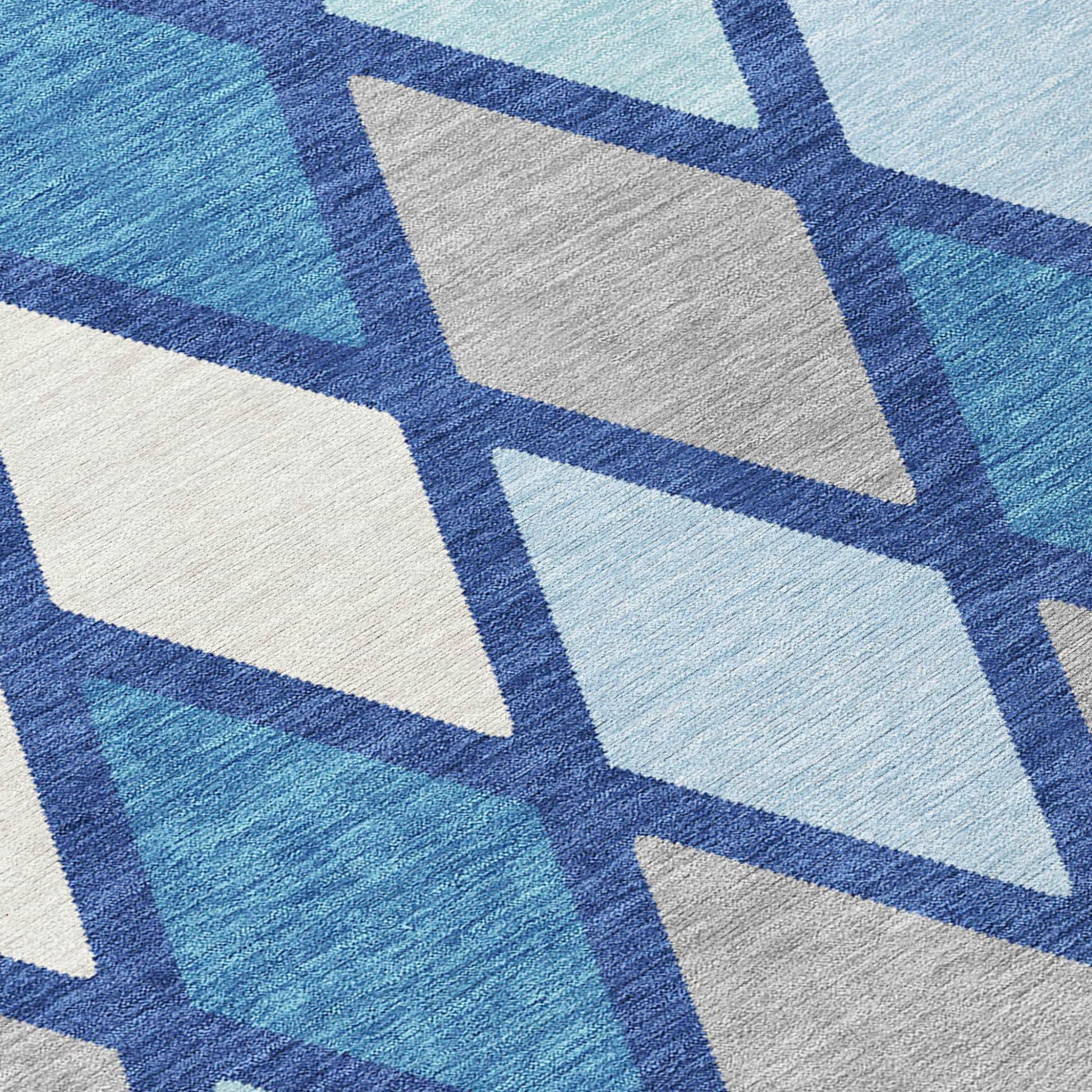 Set an inviting tone in your space with this 8-foot navy blue sky blue and ivory round geometric washable indoor outdoor area rug. This geometric round shaped rug features a geometric pattern in navy blue, sky blue, and ivory that combines a good looking print with a unique and updated shape. The mix of shape, color, and design gives this rug refreshing visual interest. Ideal for outdoor spaces or high traffic areas with kids and pets, this rug is made from heavy duty polyester that is stain resistant to help repel water, dirt, and stains. Versatile in use, durable, and easy to maintain, this rug is an ideal solution to add a decorative and inviting touch to your indoor or outdoor space. 96-inch h x 96-inch w x 0.19-inch d.