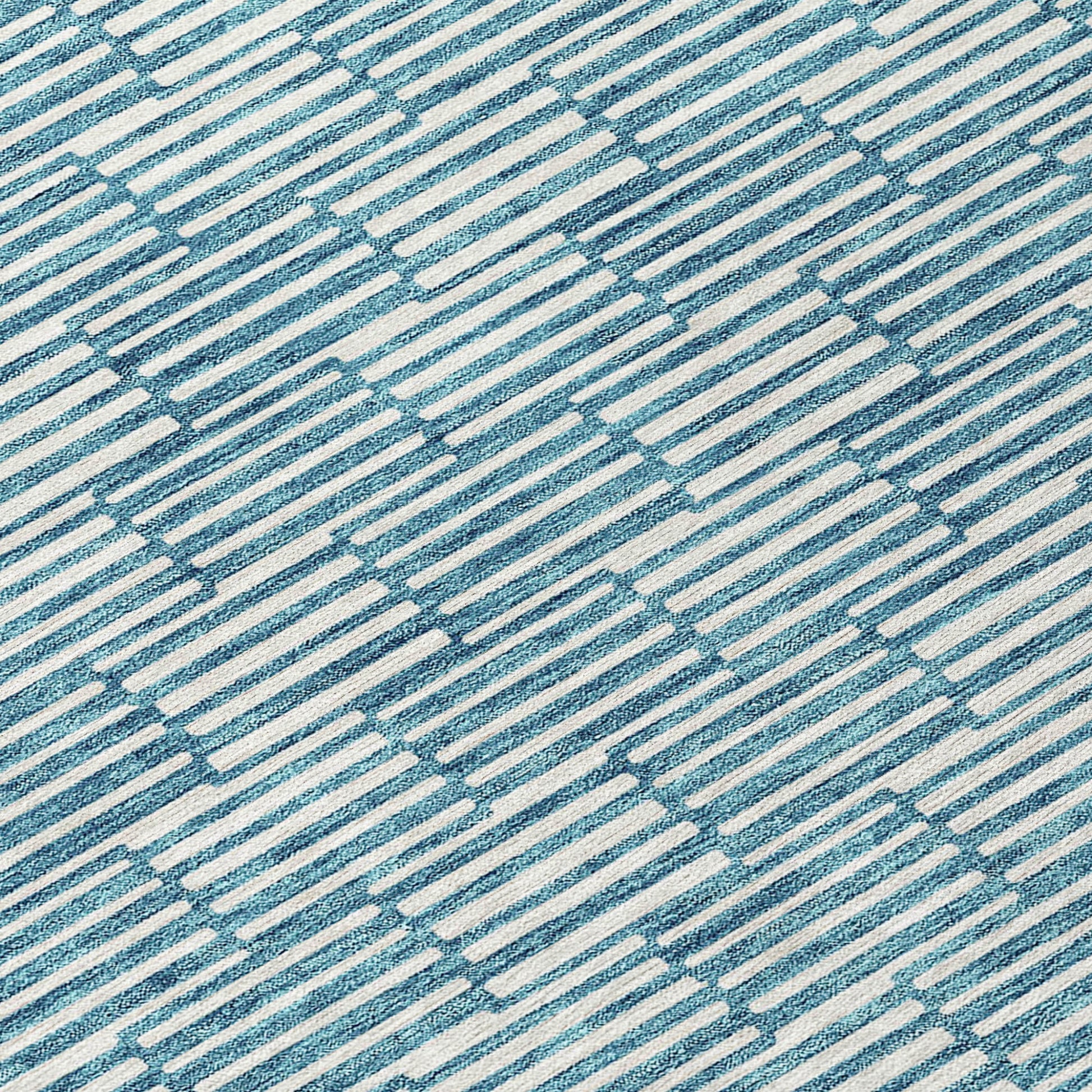 Add great coloration and comfortable texture to your space with this 8-foot teal blue and ivory round geometric washable indoor outdoor area rug. This geometric round shaped rug features a geometric pattern in teal blue and ivory that combines a good looking print with a unique and updated shape. The mix of shape, color, and design gives this rug refreshing visual interest. Ideal for outdoor spaces or high traffic areas with kids and pets, this rug is made from heavy duty polyester that is stain resistant to help repel water, dirt, and stains. Makes a great way to dress up your patio, porch, or poolside, but also works well as a durable and easy to maintain option in the kitchen, family room, or mudroom. 96-inch h x 96-inch w x 0.19-inch d.