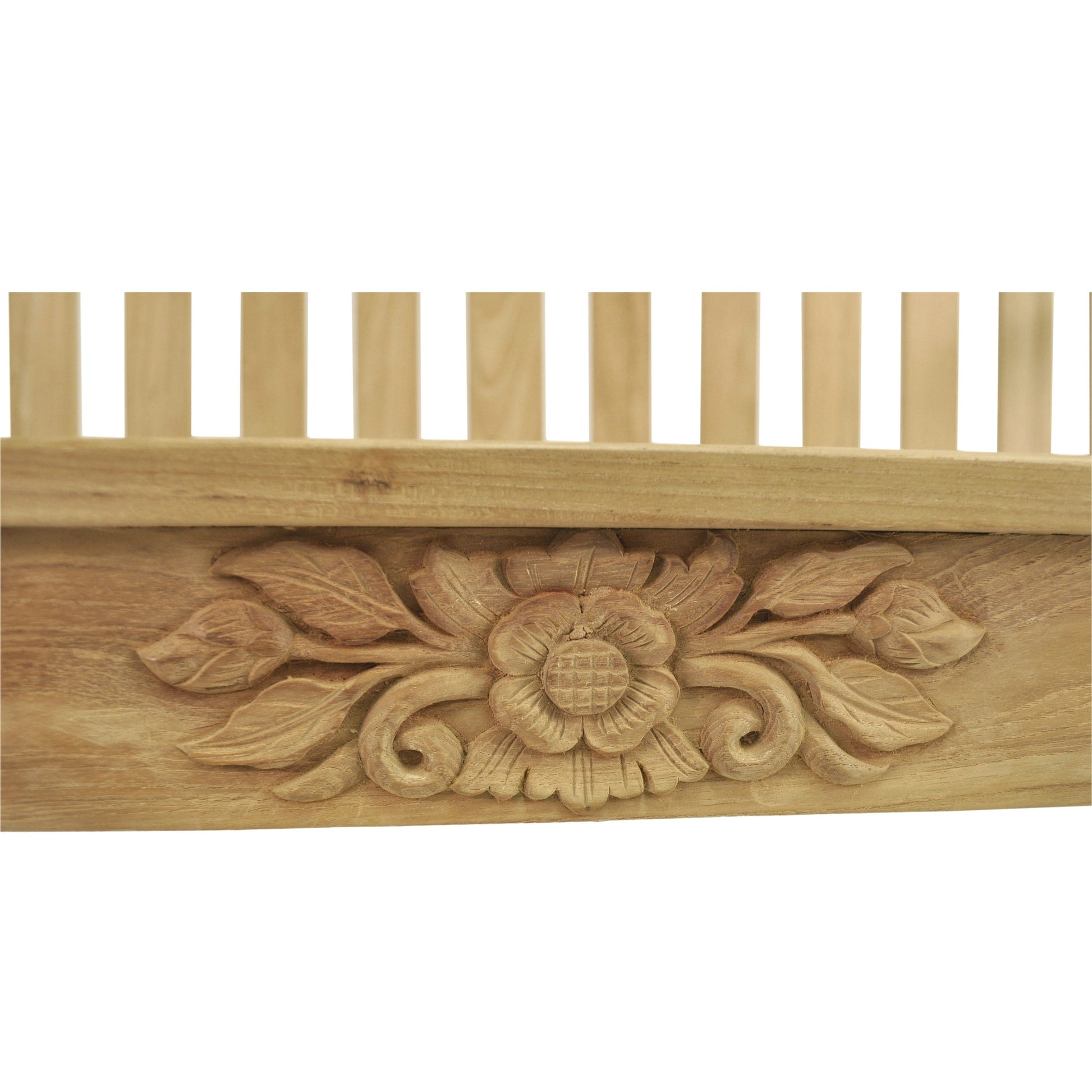 The Rose 50” Round Bench is a one of a kind teak outdoor bench perfect for the yard or patio. Its rose floral motifs are handcrafted by our professional craftsmen who uniquely know the art and beauty of hand carved wood. This simple traditional styled bench will never go out of style, but seamlessly blends with any décor or setting. We have made subtle but careful design changes to ensure excellent back and seating support. Add Sunbrella All-Weather Cushions for added seating comfort, a water repellent material that prevents mildew, mold, and discoloration. Constructed from Premium Teak wood without finish in its natural form and color, it is the perfect material for weathering the outdoors through rain, hail, or shine.