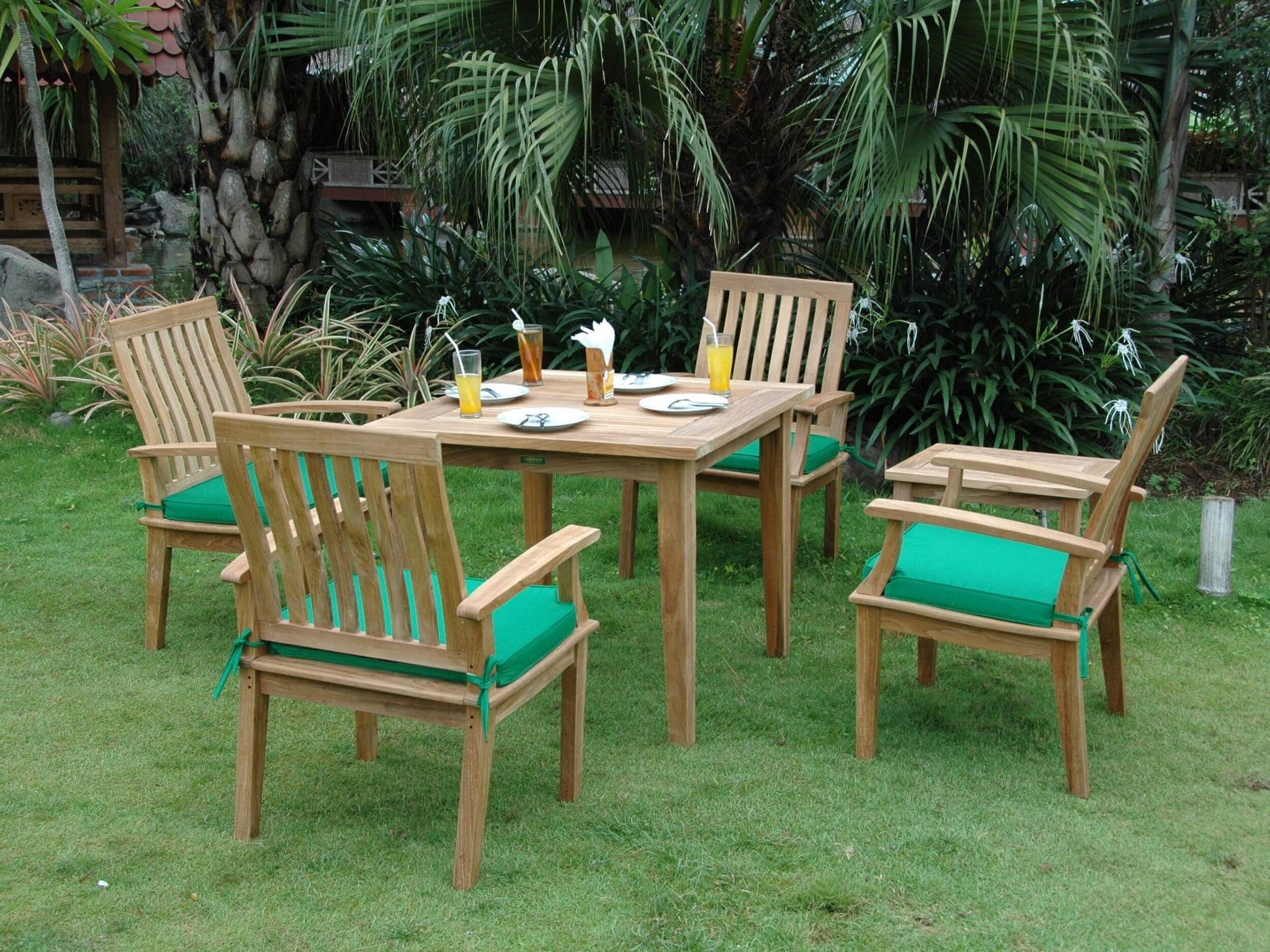 Enjoy an outdoor lunch in the comfort of the yard with this stylish modern-classic teak furniture. With its tapered legs, reclined back and curved armrests, be sure to add All-Weather Sunbrella Cushions for greater comfort with color of your choice. A reliable and stylish teak outdoor set, it is crafted from the finest java teak wood designed and sanded smooth without any finish in its natural form and color; a perfect material for weathering the outdoors. Overtime, the set will weather into a patina grey, or scrub down with soap and water to keep in pristine condition.