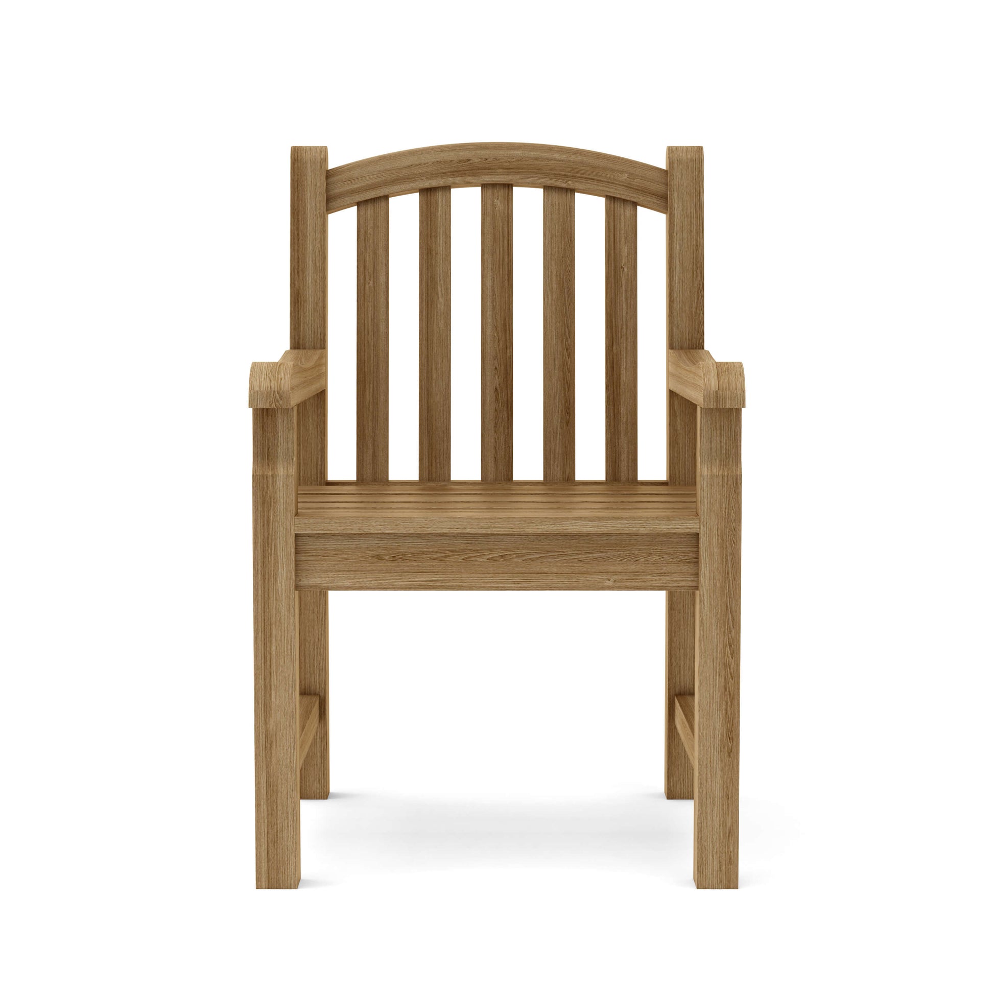 The Chelsea Dining Armchair, traditional in design with unmatched comfort is the perfect teak chair for the yard and outdoors. We have made careful design changes to the seats center and it’s back to ensure a seating style that is both comforting and sturdy. Made of kiln-dried, Grade-A Teak, it is sanded smooth and unfinished for a natural smooth finish. Some assembly required. Instructions and all necessary parts included. Made from the finest solid teak, which is strong and durable, this is a beautiful and functional piece of furniture for your patio or terrace. Place multiple chairs in your backyard with a dining table to create an outdoor dining experience.