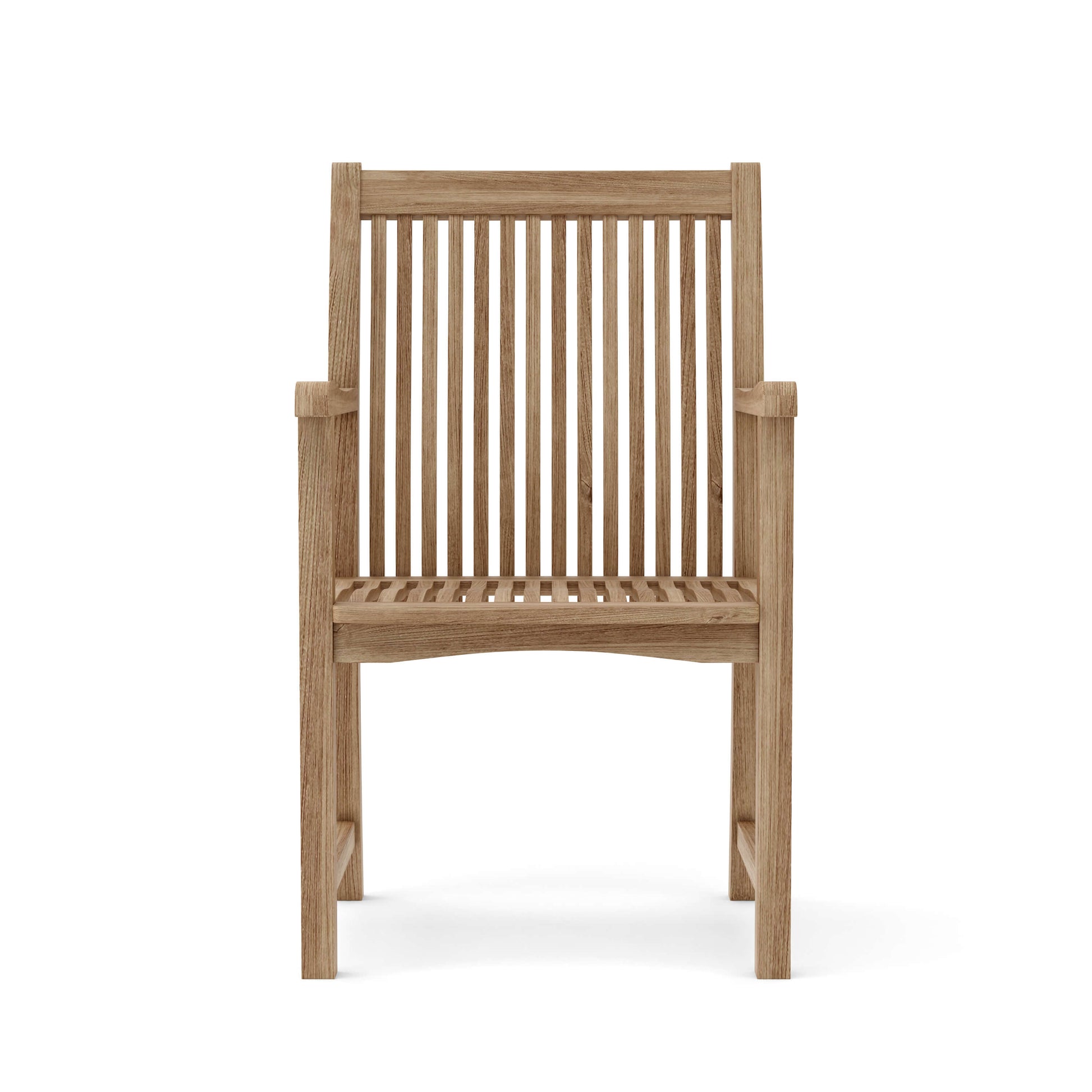 The Chicago Dining Armchair is a classic piece of furniture that will never go out of style, but quietly blends with any décor or setting. The seat is sculpted for added comfort but is also sturdy, as is the back support that’s made of individual teak slats. Made with kiln-dried, Grade-A Teak wood, it is the perfect material for weathering the outdoors. Place this chair in your backyard with a dining table for an outdoor dining experience. Overtime, the table will weather into a patina grey, or scrub down with soap and water to keep in pristine condition. This is a beautiful and functional piece of furniture for your patio or terrace.