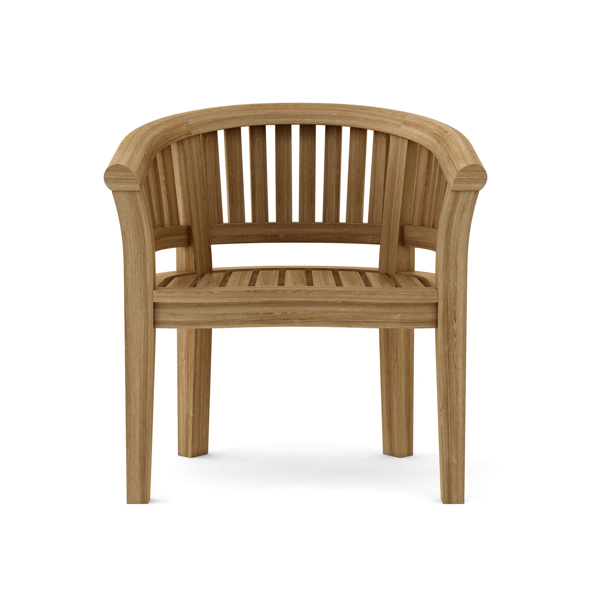 This solid teak “Curve Dining Armchair Extra Thick” is the perfect chair for your patio or garden. Sturdy, bulky, and durable, extra thickness of the wood was used around the chair and armrest for a quality built design. Made from kiln-dried Grade-A Teak, it is the perfect material for weathering the outdoors through rain, hail, or shine. Overtime, the chair will weather into a patina grey, or scrub down with soap and water to keep in pristine condition.