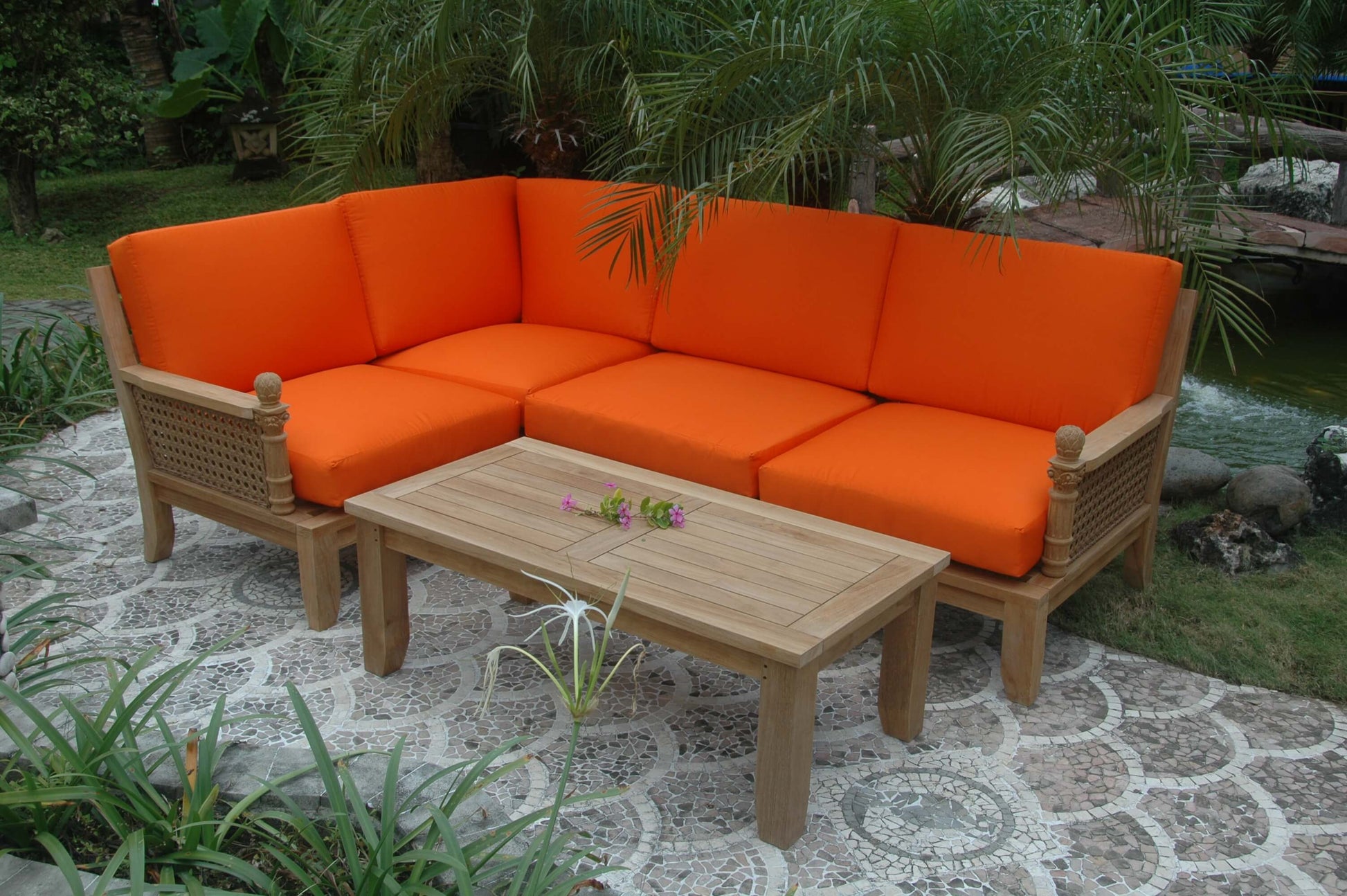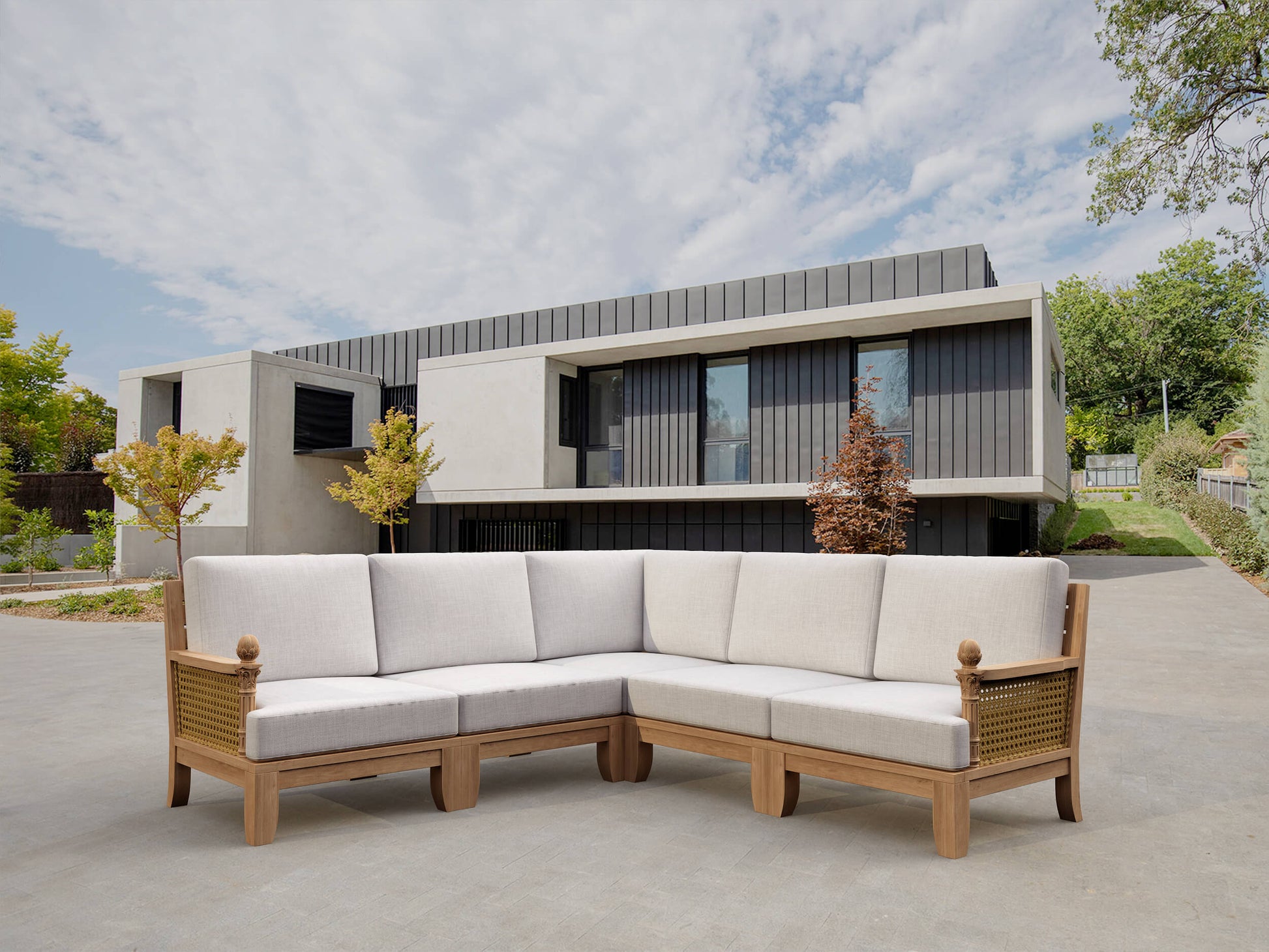 The Luxe Modular Deep Seating Set comfortably indulges whoever sits in its presence. The armchair style provides elegance, comfort and uniqueness for your backyard with one of a kind finial artichoke and wicker webbing made of Synthetic Rattan, the sides of the armchair are intricately designed culminating with pineapple floral motifs handcrafted from our expert craftsman of teak wood. Constructed from extra thick Premium Grade-A Teak, it is unfinished in its natural state and color. All-Weather Cushions from Sunbrella fabrics with color and choice options included.