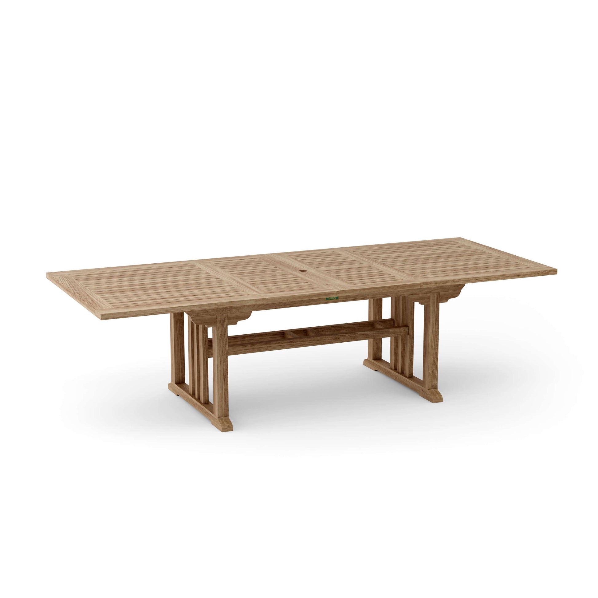 This outdoor dining set with seating for 12 is the complete addition for your outdoor dining needs. The Sahara 106" Extension Table stands 29″ high and is 43″ wide by 74″ long and when fully extended can reach an opening of 106″ in length. The table can be extended with 1 or 2 leaves, seating 10 to 12 people comfortably. Available with umbrella hole and brass plug when not in use,its perfect for a party with family and friends. Set also includes 12 Rialto Dining Chairs, a sturdy yet comfortable dining chair featuring high back support adding comfort to your lumbar. Table and chairs made of solid premium teakwood unfinished with kiln dried process to ensure quality to last generations.