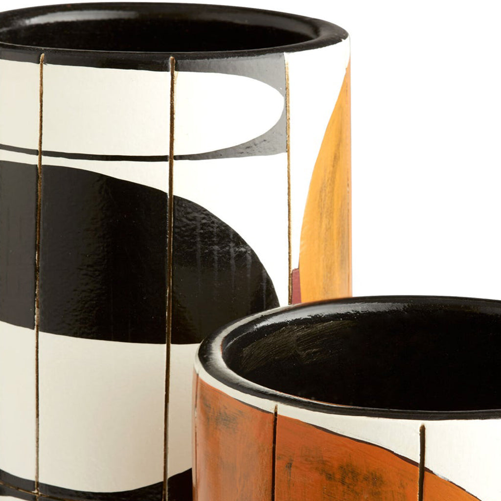 A modern mixture of geometric shapes displayed on the glazed ceramic pair of Sakura vases makes them an exceptional addition to any contemporary space.