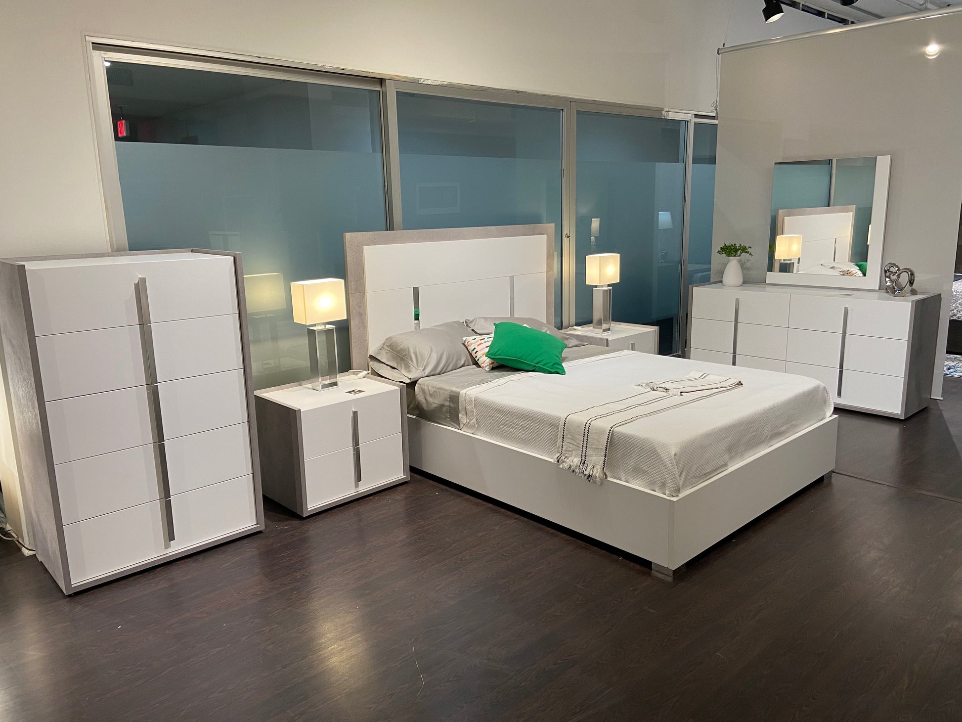 The sides and back of the Ada case goods feature panels that replicate design and texture of natural slate stone in grey color tonality whereas the front has a white matt lacquering finish to create an organic-modern style. The “tray design” visible on the top is a classic modern silhouette that has never faded and add visual character. The metal handles are lined up to create a vertical line partially mirrored on the headboard. Nightstands, chest and dresser have generous sizes to fill a roomy bedroom space. The Ada bedroom collection adds an organic touch to your home.