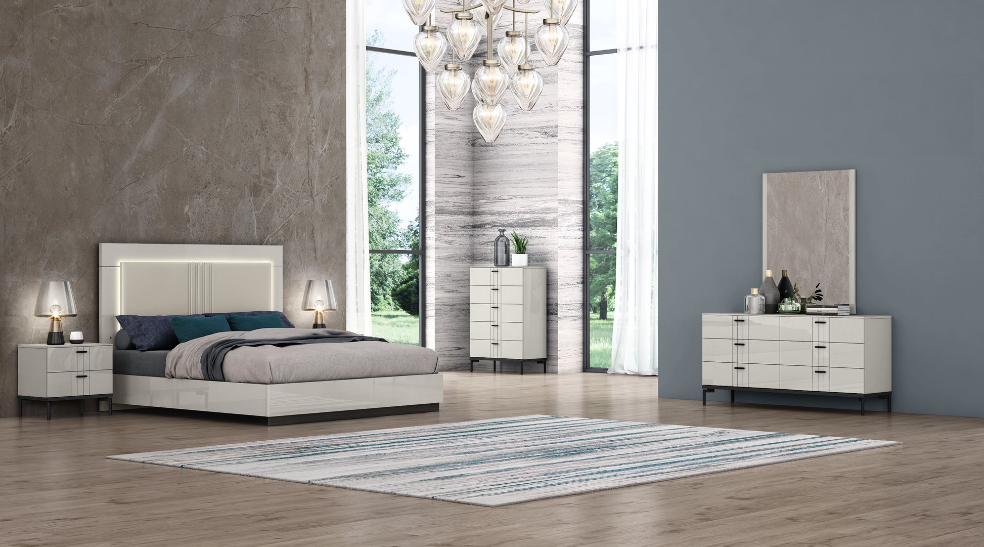 The Bella Bedroom Collection by J&M is the newest addition to our Modern Bedroom Category. Blending modern aesthetic with contemporary elements, the Bella Collection is a masterpiece of design. The Headboard features a beautiful grey leatherette upholstery, with a pleated pinstripe design adorning the center. The pinstripe design is carried over into all of the case goods, featuring the same look throughout all pieces. The grey high gloss lacquer finish is the perfect compliment to the centerpiece headboard. All pieces are also accented with matte black hardware and legs, really setting this style apart by utilizing striking contrast to the fullest extent. All drawers feature our premium soft close mechanism, and the headboard features an encompassing LED light strip, further accentuating the stunning upholstery finish.