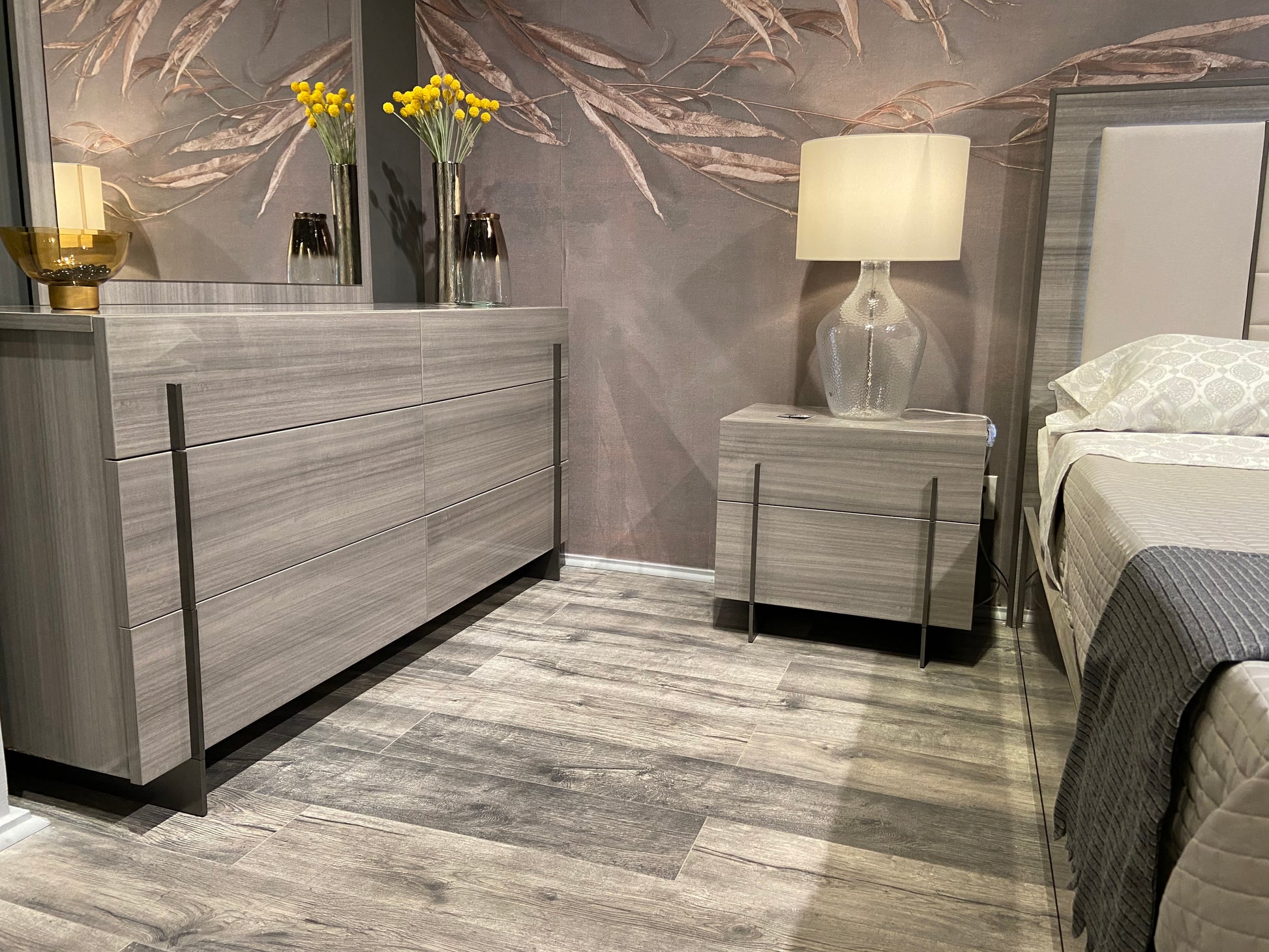 The Blade Bedroom Collection showcases an innovative and luxurious design created by the metal “blades” that start underneath the case goods and extend to the front to serve as handle for the drawers. The design is replicated on the headboard where two metal bars sink into a velvety upholstered panel. Hidden behind the edges of the panel there is a stripe of led lights that serve as courtesy lights operated by invisible switches located on each side of the headboard. These panels feature eucalyptus grain black stripes over a grey color with a glossy finish. This sophisticated modern-industrial design is a great addition to the furnishing of your house.