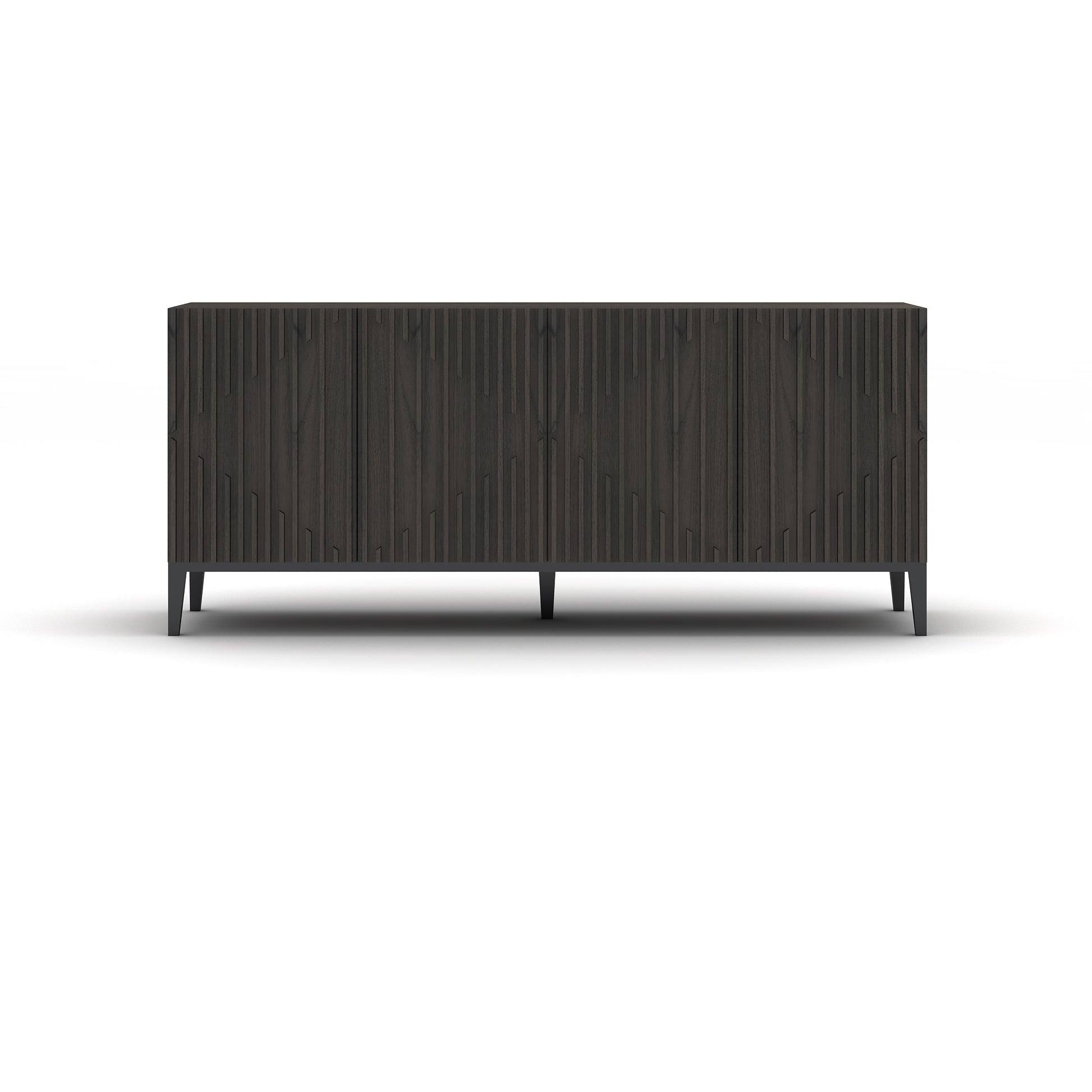 Clean lines and a luxurious wood finish is what distinguishes the Moderna Dining Set collection. The collection is designed with a beautiful dark oak veneer to highlight the clean lines featured prominently in the design. The dining table's pedestal base also displays the beautiful vertical line aesthetic. The buffet's four large doors with horizontal interior shelving also provide plenty of storage for all of your house hold dining needs. The dining chairs emphasize comfort and style over everything, upholstered with a beautiful dark grey colored leatherette. The subtleness of the design allows this versatile set to easily blend in with most modern interiors.