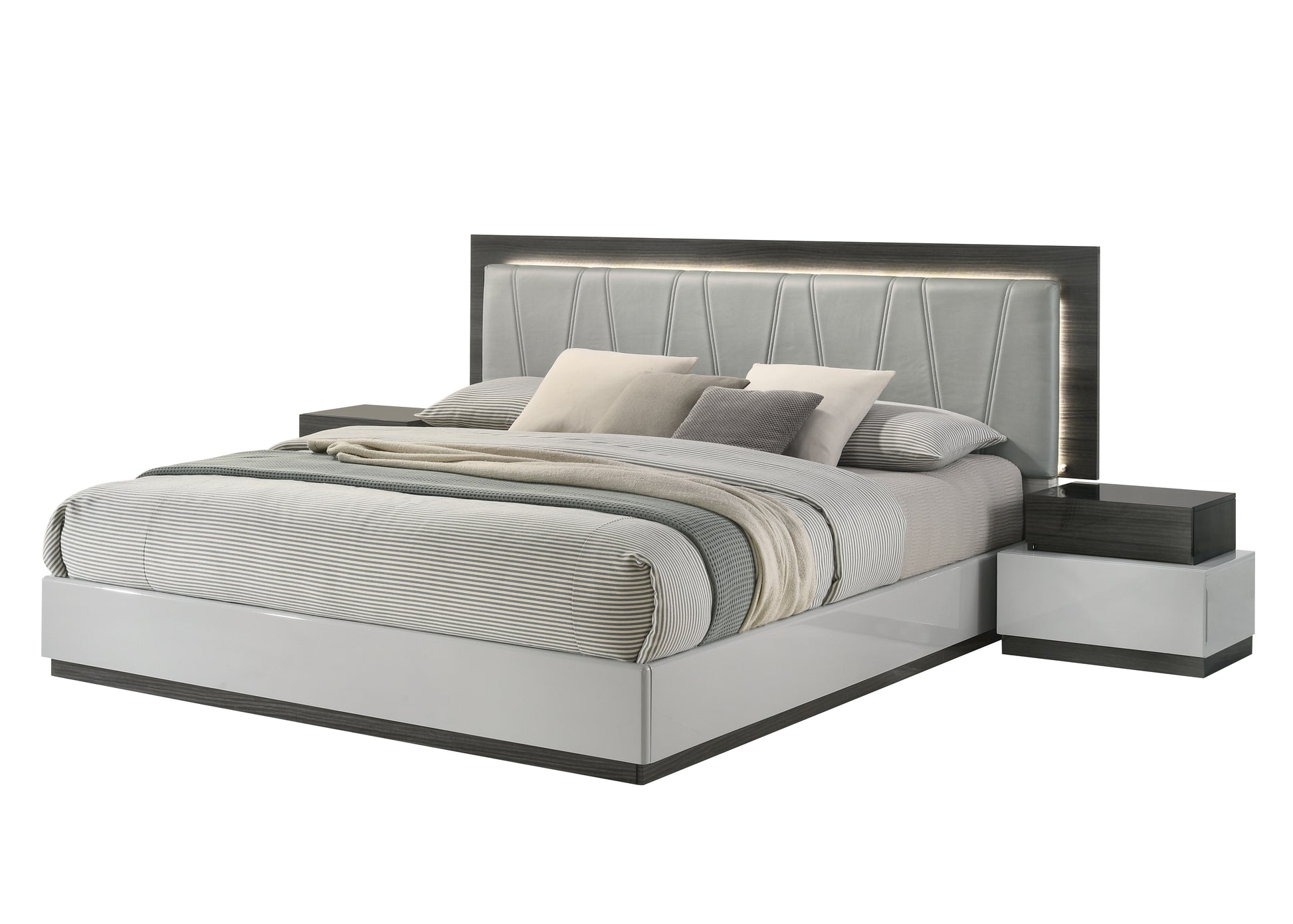 Introducing the Cube Bedroom Set from J&M Furniture. This elegant set combines modern sophistication with functional design. Featuring a stunning light grey high-gloss finish contrasted by rich high gloss dark zebra grey, this set creates a sleek, contemporary ambiance for any bedroom. The bed’s headboard is upholstered in luxurious light grey eco-leather for added comfort, while the built-in LED light provides a soft, elegant glow to enhance the cozy atmosphere.