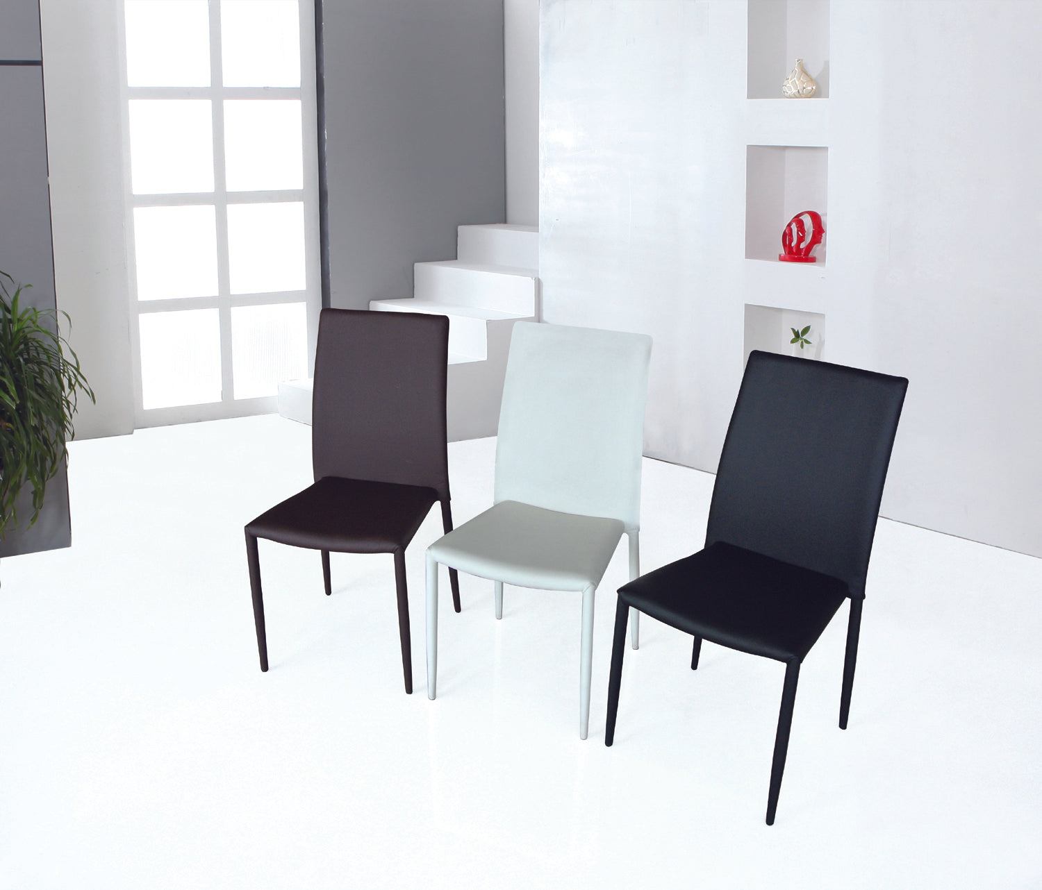 The modern dining leather chairs will accent any environment. Available in Black, White, and Chocolate, these leather covered chairs will give you infinite matching options.