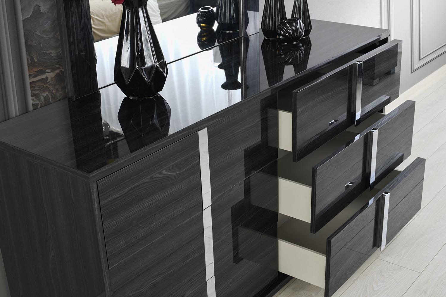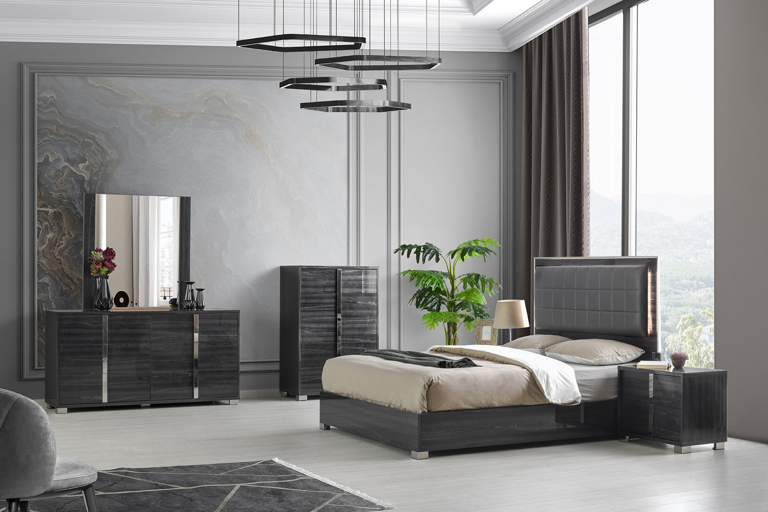 Sleek, modern, trendy, and durable are the traits of Giulia Bedroom collection. This stylishly contemporary collection features sleek design elements like chrome drawer pulls that draw subtle attention. Additionally, Giulia is equipped with a modern LED light glow on the headboard. The collection features three magnetic colors: Gloss White, Gloss Pattern Grey, and Matte Gray Oak.