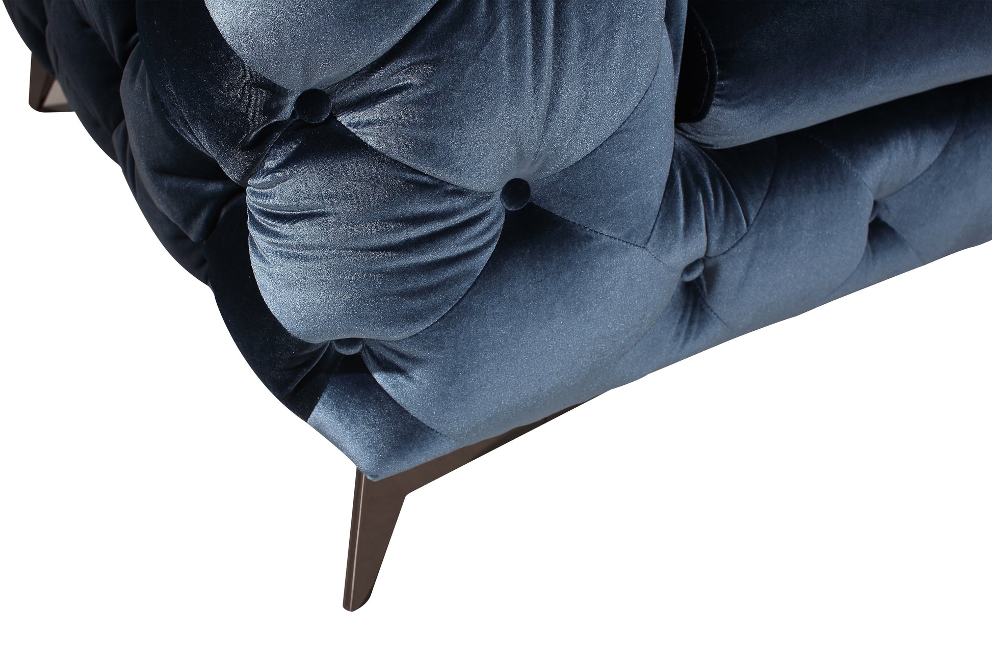 J&M Is proud to present the Glitz Sofa Set. This modern interpretation of the timeless chesterfield sofa is hand sewn using Velour Fabric to enhance the detail & quality of the tufted cushions. Gun powder grey legs contrast the majestic velour which comes in a royal blue, or imperial purple. This set can be ordered in a wide array of fabrics. Please note special orders may take 12-16 weeks.