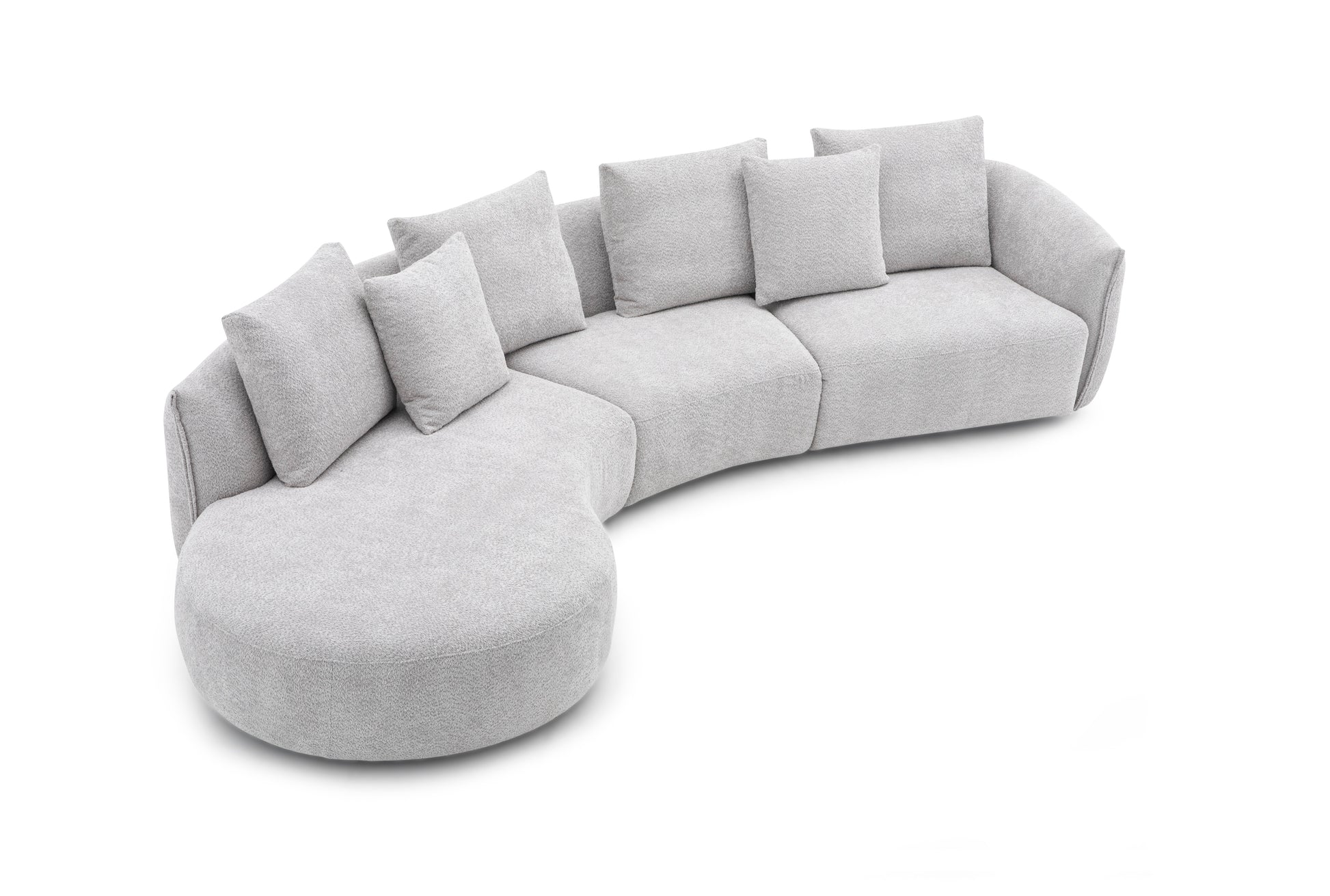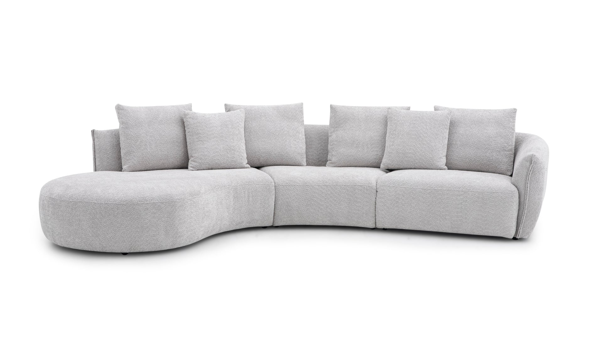 This sectional is available in either left-hand facing (LHF) or right-hand facing (RHF) configurations, ensuring it fits seamlessly into any room layout. The standout feature is the unique, gracefully rounded chaise, adding a touch of elegance and fluidity to the design, making it a true statement piece.