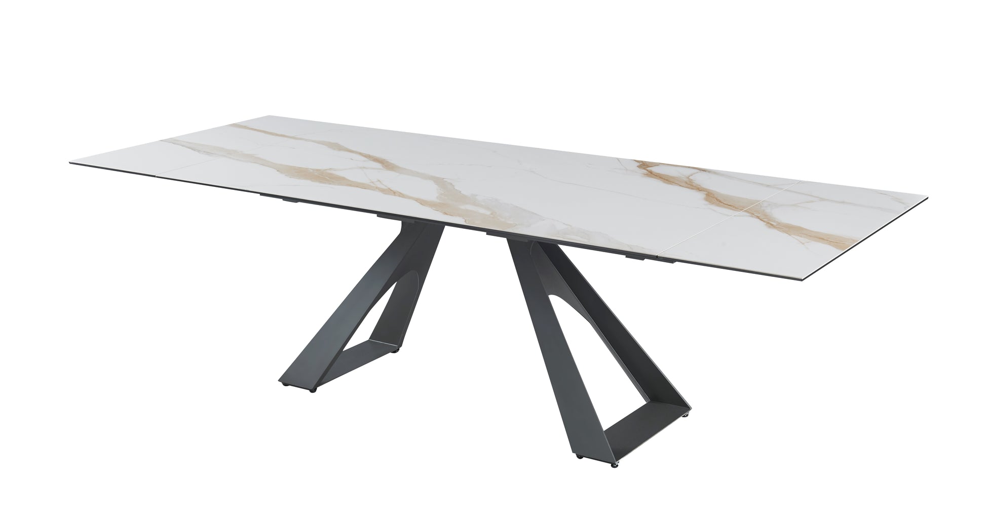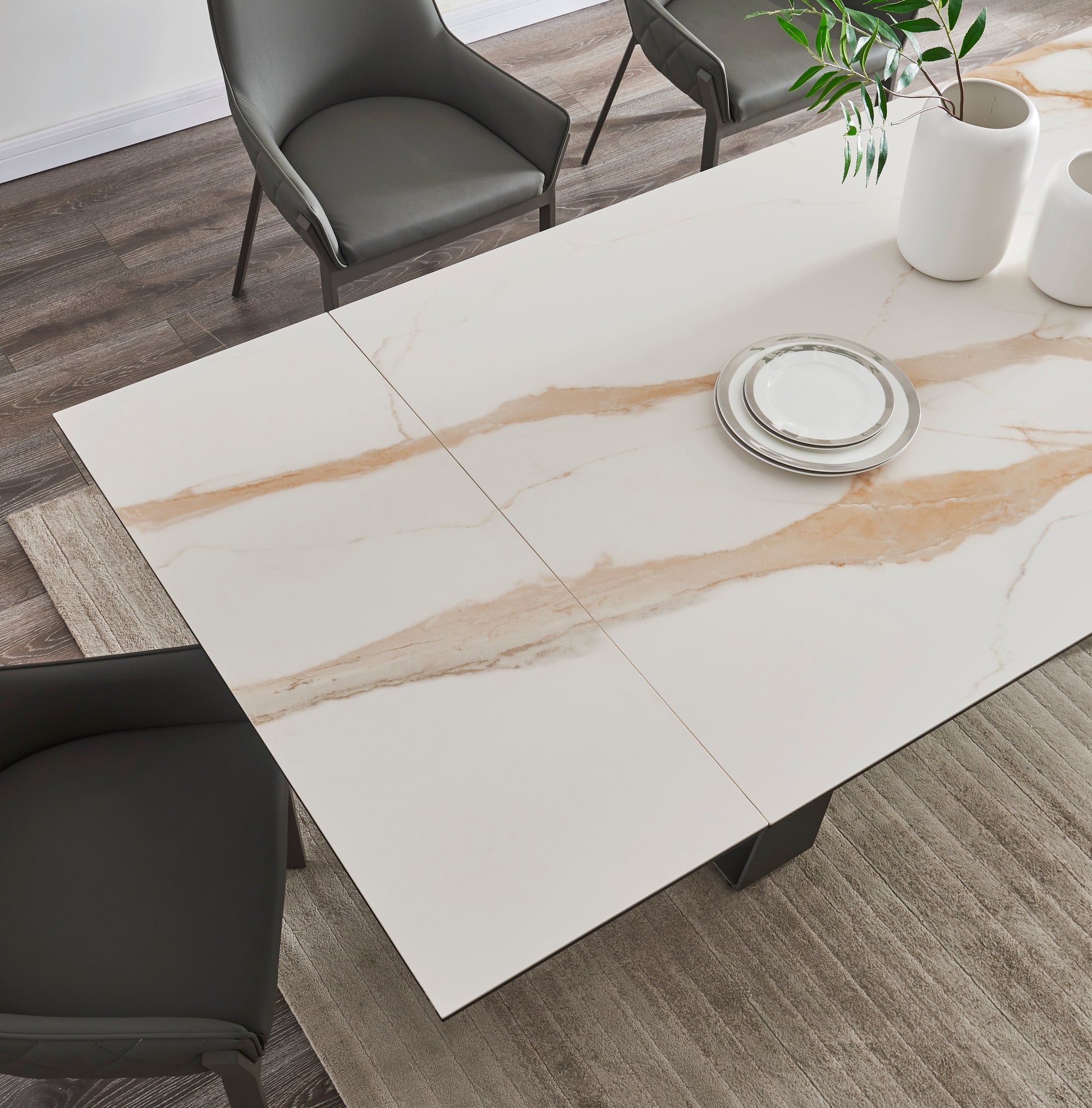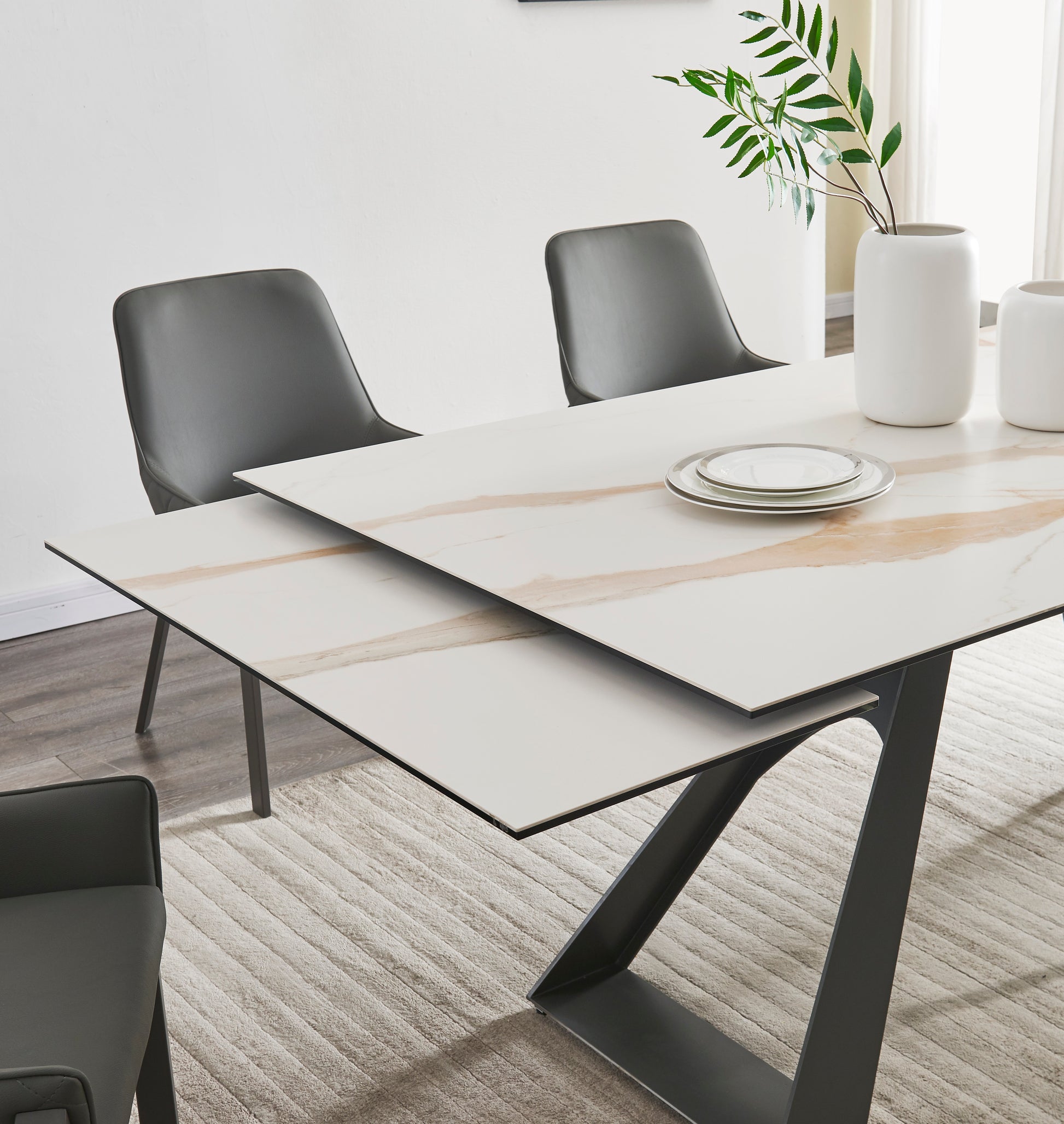 The Swan Extension Table features a matte white ceramic top with brown veins throughout, and extensions on either side, resting upon a gunmetal coated steel base. The table extensions feature an easy glide mechanism, to seamlessly allow it to transition depending on your dining needs.