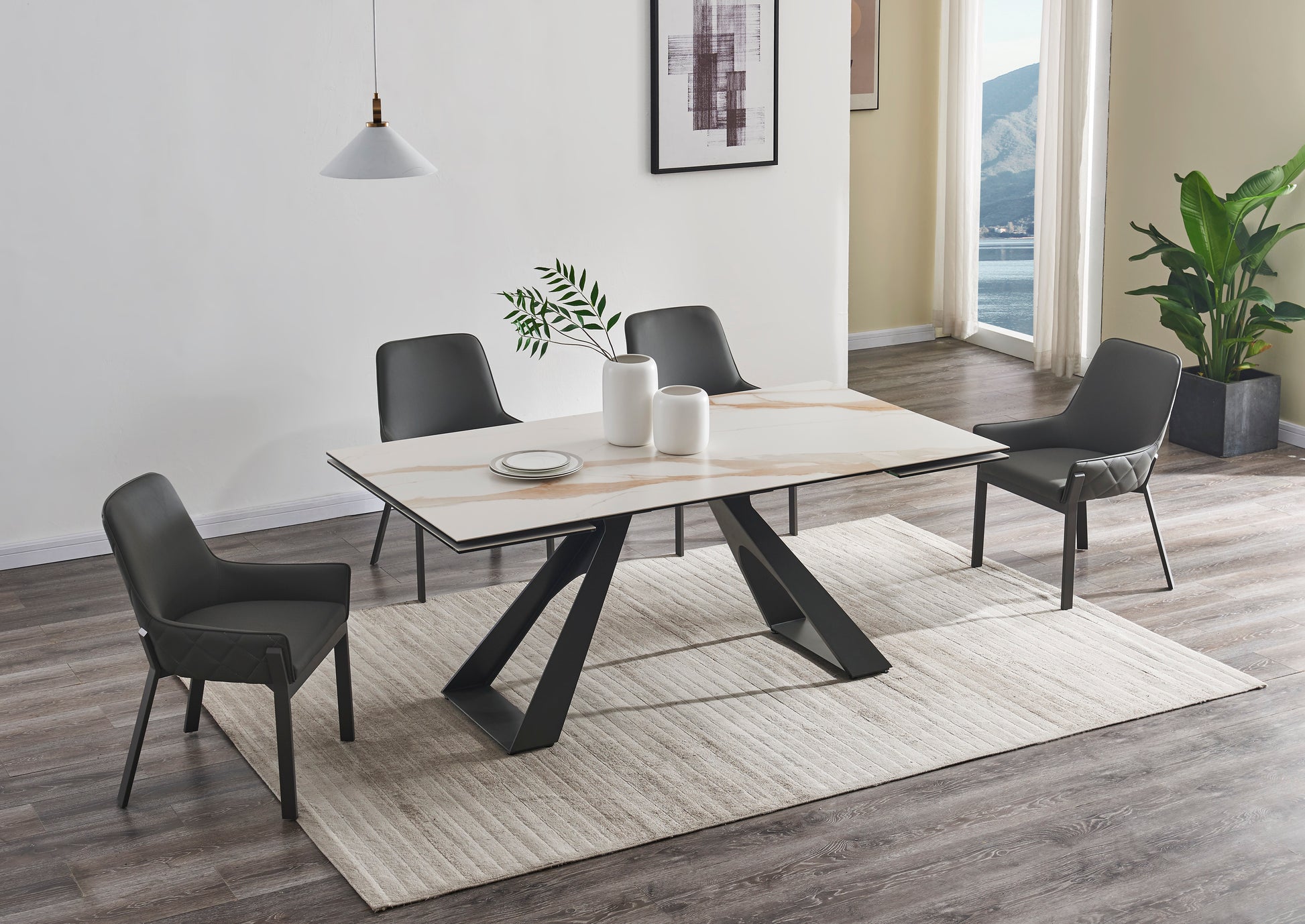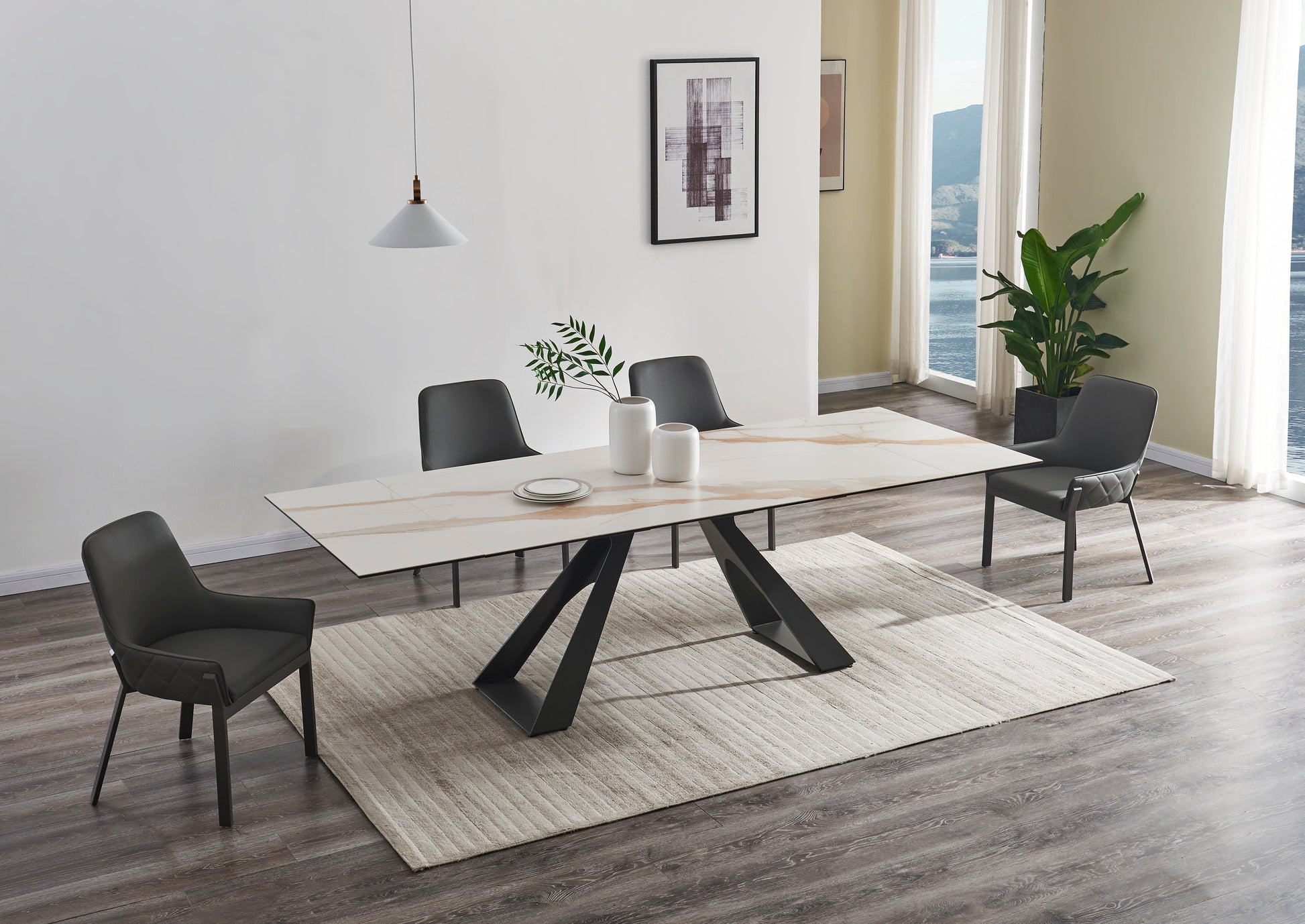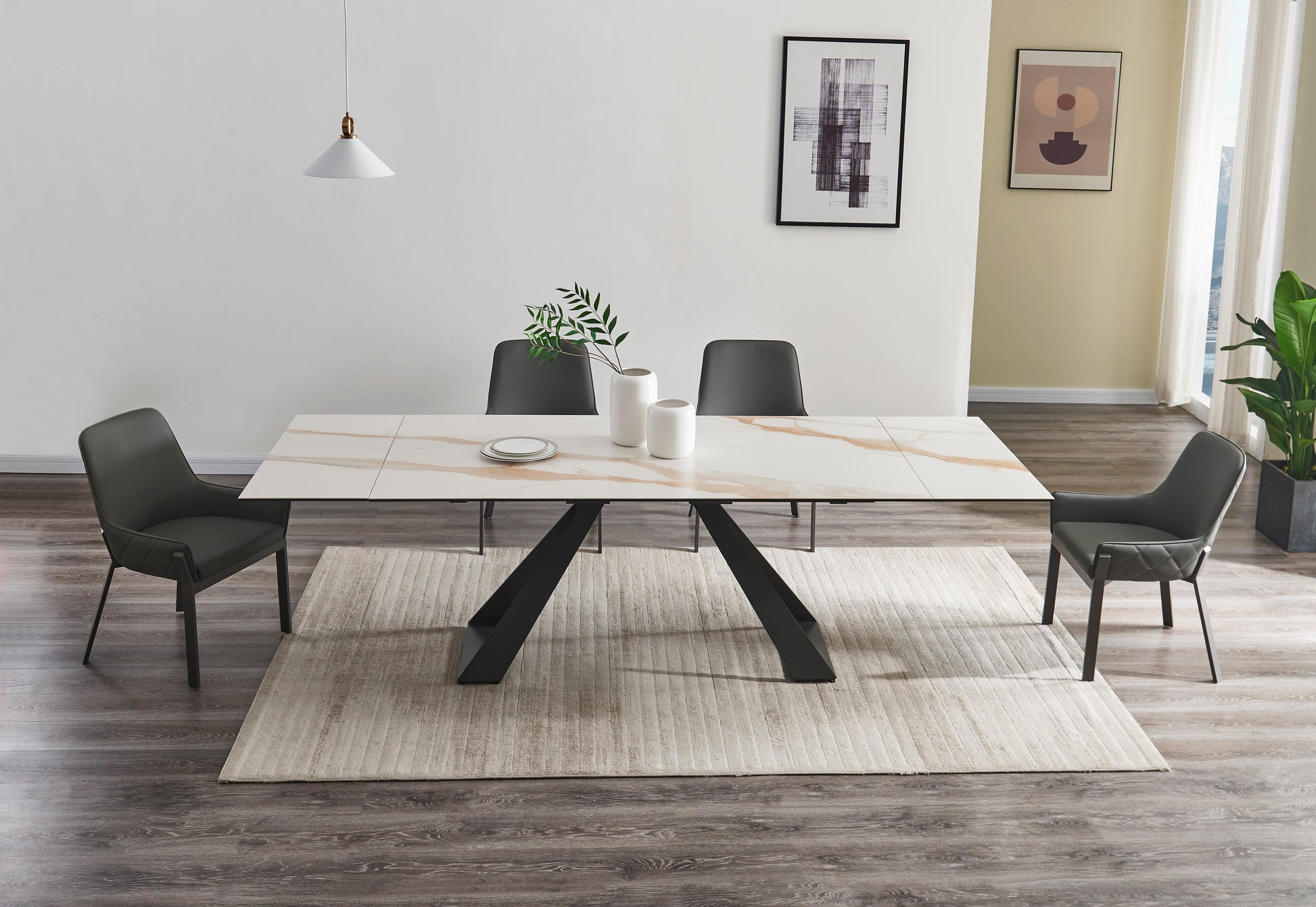 The Swan Extension Table features a matte white ceramic top with brown veins throughout, and extensions on either side, resting upon a gunmetal coated steel base. The table extensions feature an easy glide mechanism, to seamlessly allow it to transition depending on your dining needs.