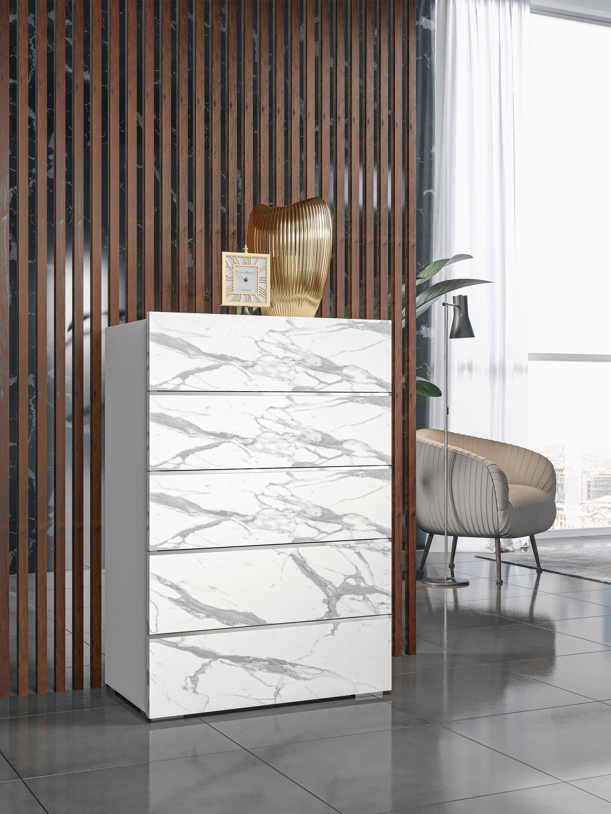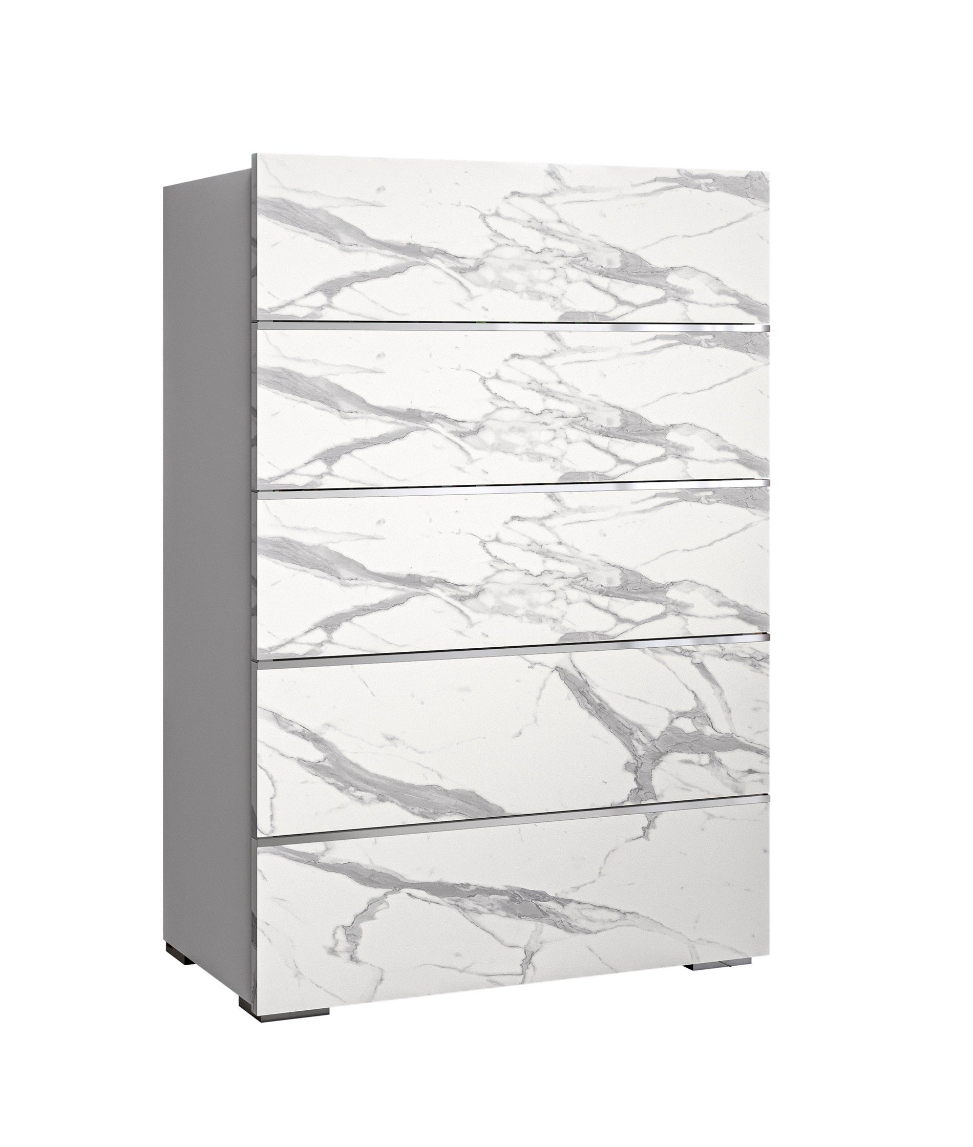 The Nina Bedroom collection by J&M Furniture is our answer to the popular demand for lavish oversize headboards. The Nina Bedroom, made in Italy, is designed to prominently display the headboard; every detail complements and accentuates it perfectly. The headboard is upholstered in a grey velvet, partitioned by chrome accents. The body of the bed and accompanying case goods are finished in a white high gloss lacquer. All case good also prominently feature a white and grey marble look finish, further elevating this collection’s overall appeal.