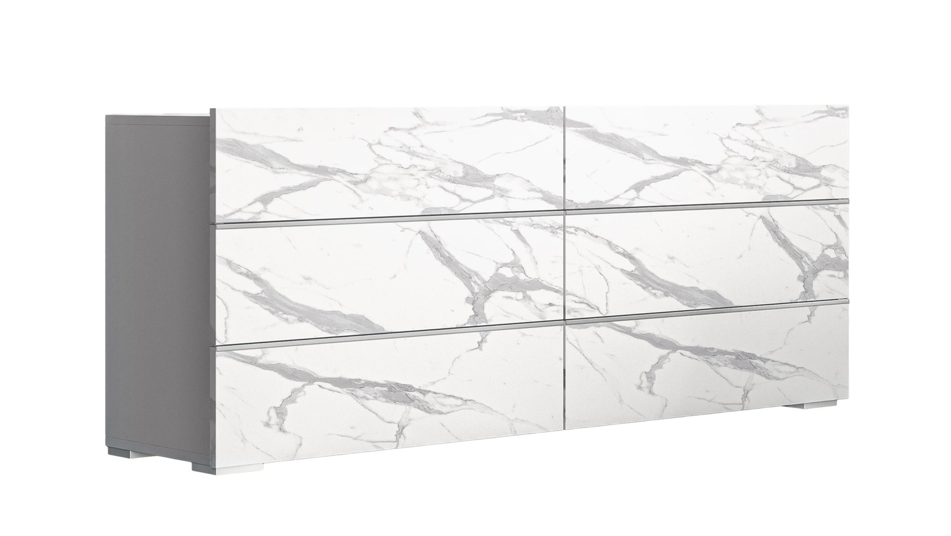 The Nina Bedroom collection by J&M Furniture is our answer to the popular demand for lavish oversize headboards. The Nina Bedroom, made in Italy, is designed to prominently display the headboard; every detail complements and accentuates it perfectly. The headboard is upholstered in a grey velvet, partitioned by chrome accents. The body of the bed and accompanying case goods are finished in a white high gloss lacquer. All case good also prominently feature a white and grey marble look finish, further elevating this collection’s overall appeal.