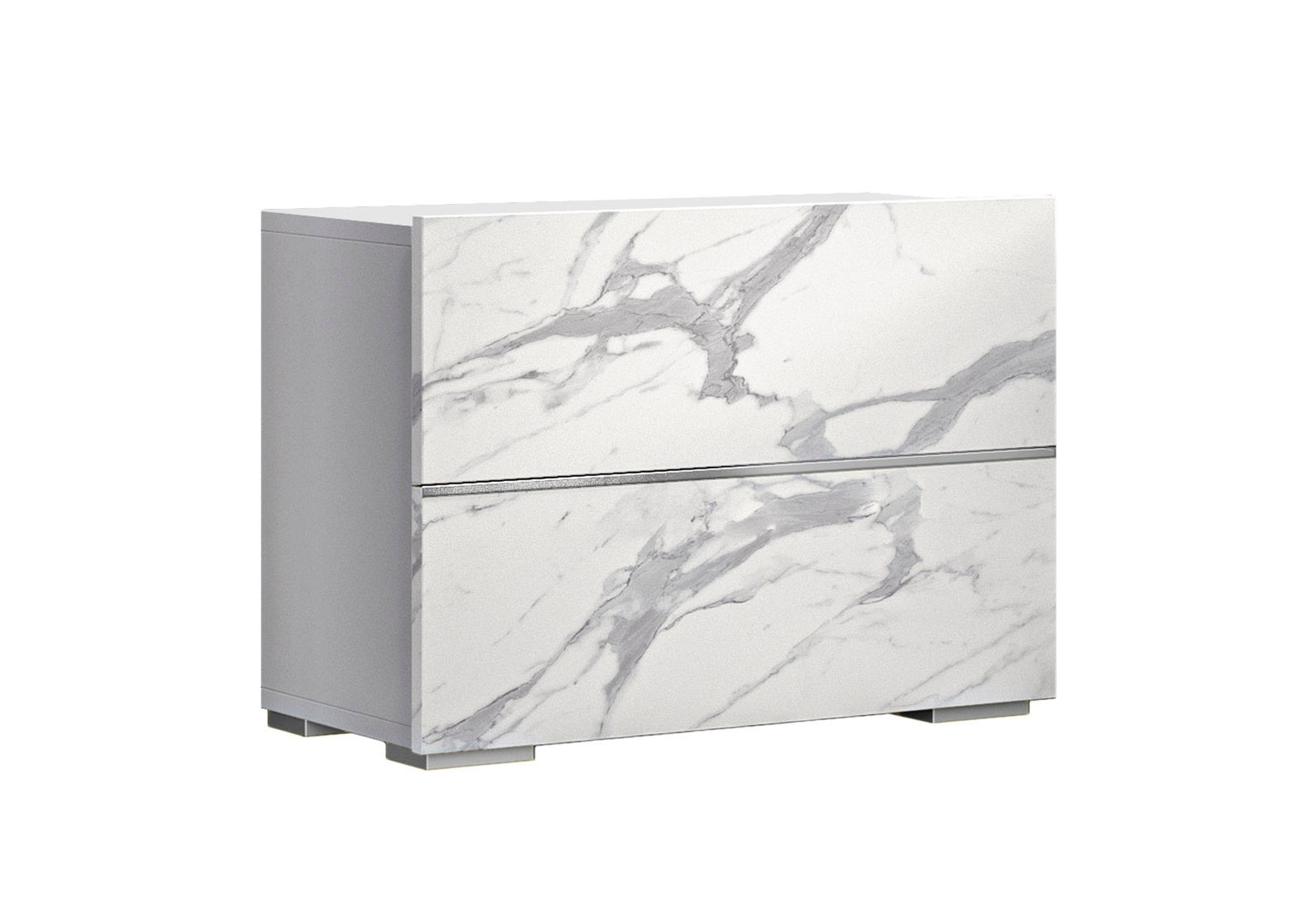 The Nina Bedroom collection by J&M Furniture is our answer to the popular demand for lavish oversize headboards. The Nina Bedroom, made in Italy, is designed to prominently display the headboard; every detail complements and accentuates it perfectly. The headboard is upholstered in a grey velvet, partitioned by chrome accents. The body of the bed and accompanying case goods are finished in a white high gloss lacquer. All case good also prominently feature a white and grey marble look finish, further elevating this collection’s overall appeal.