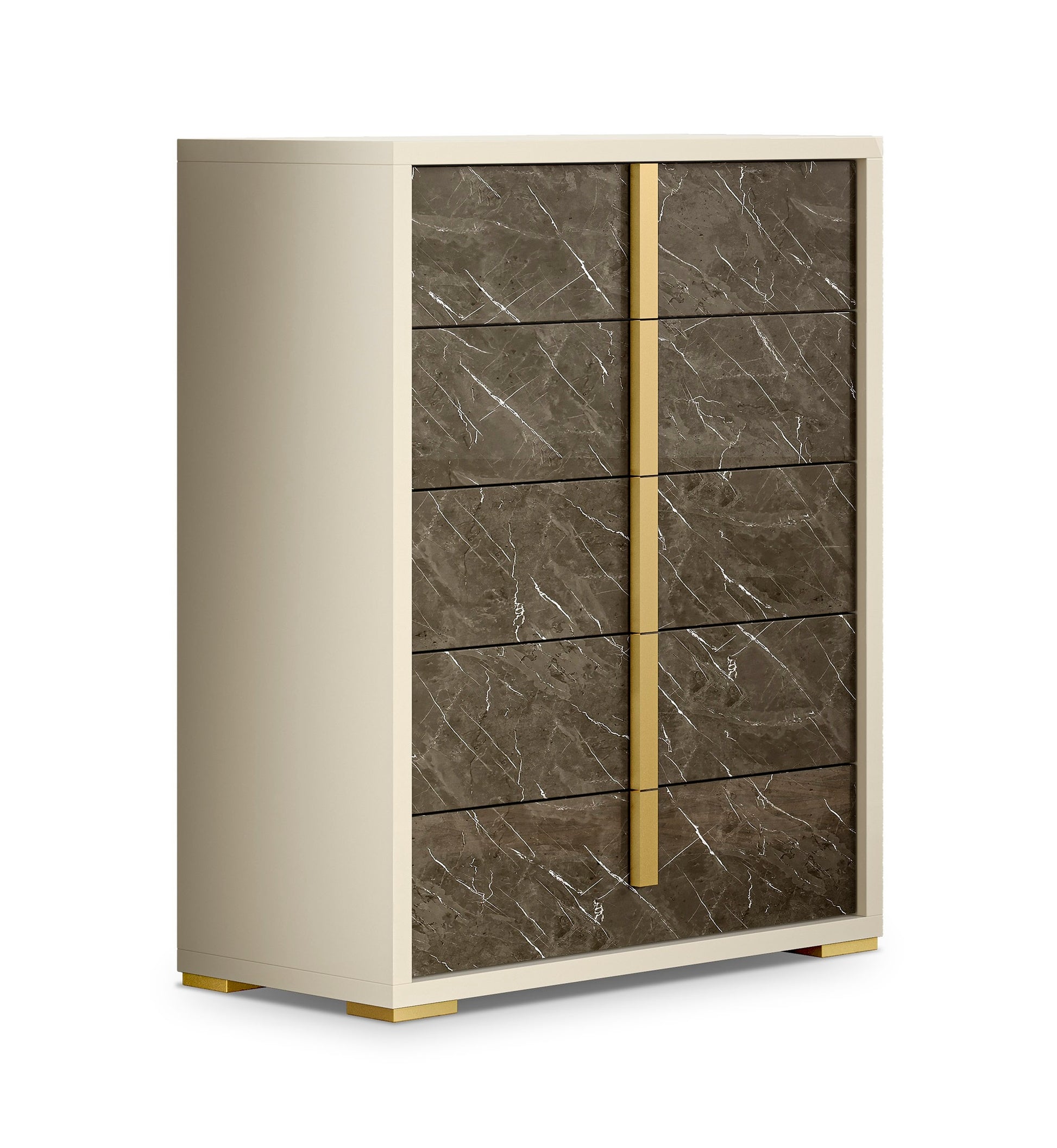 The Sonia Bedroom collection by J&M Furniture is a great new addition to our modern bedroom category. The Sonia Bedroom blends a sophisticated pearl high gloss lacquer finish with gold accents. The headboard and case goods feature a fractured brown & cream marble look, and the LED light on the bed further highlights this finish. The Sonia Bedroom is made in Italy using the finest quality materials and construction.