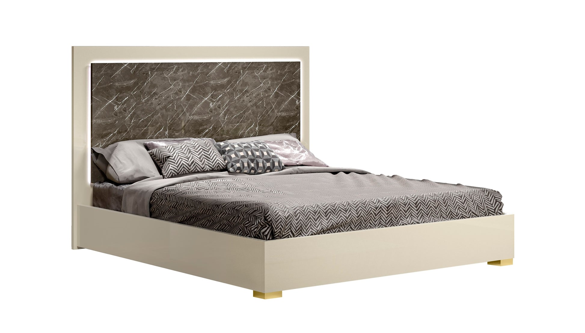 The Sonia Bedroom collection by J&M Furniture is a great new addition to our modern bedroom category. The Sonia Bedroom blends a sophisticated pearl high gloss lacquer finish with gold accents. The headboard and case goods feature a fractured brown & cream marble look, and the LED light on the bed further highlights this finish. The Sonia Bedroom is made in Italy using the finest quality materials and construction.