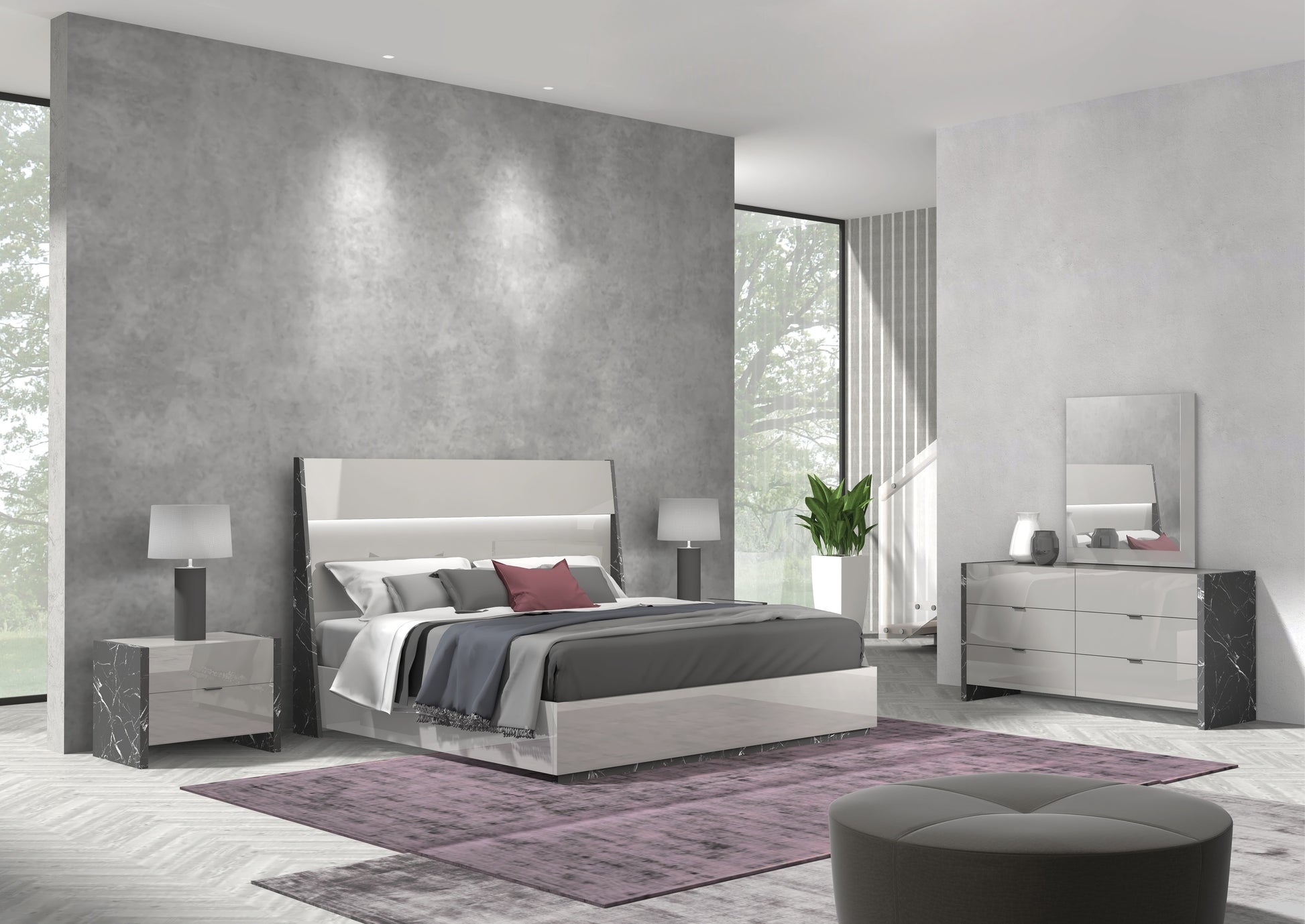 The side panels of the case goods and bed are the design motif that stands out in the Stoneage Collection. They are made in a generous size and finished with a unique black zebra marble. The case goods side panels work as a vice that holds in place the suspended central body whose drawers are equipped with “invisible” handles to preserve the minimalist modern design. The finish on the drawers features a popular light grey lacquer color. The headboard is made by 2 panels positioned in different planes to create an indentation where is positioned a strip of small led lights. The strip is operated by invisible switches located in each side of the bed and provide courtesy and reading light beside adding esthetic visual appeal to the bed. This modern-midcentury design made with clean lines and neutral colors is an exciting, original design that will never make you tired.