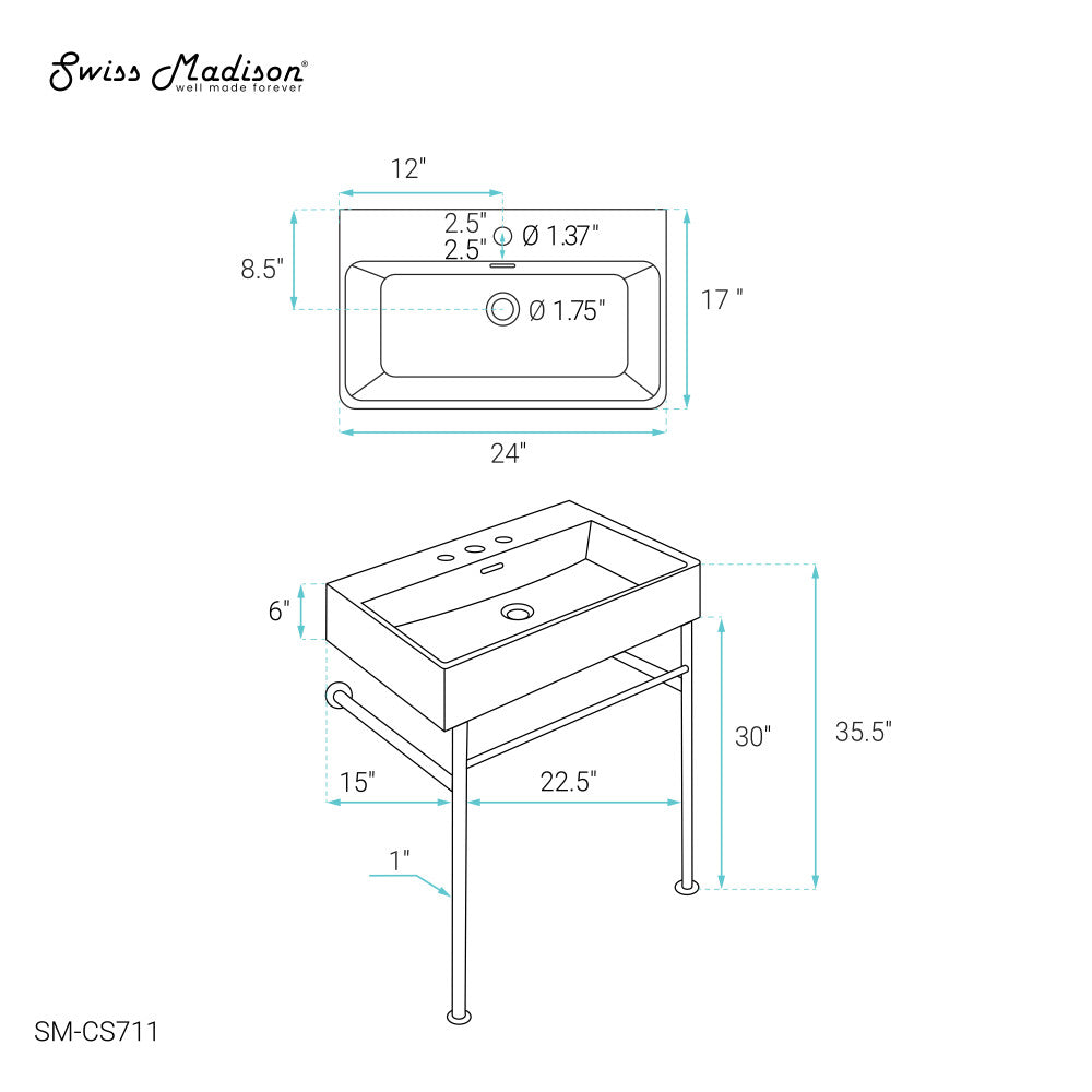 Swiss Madison Claire 24 Ceramic Console Sink White Basin Chrome Legs