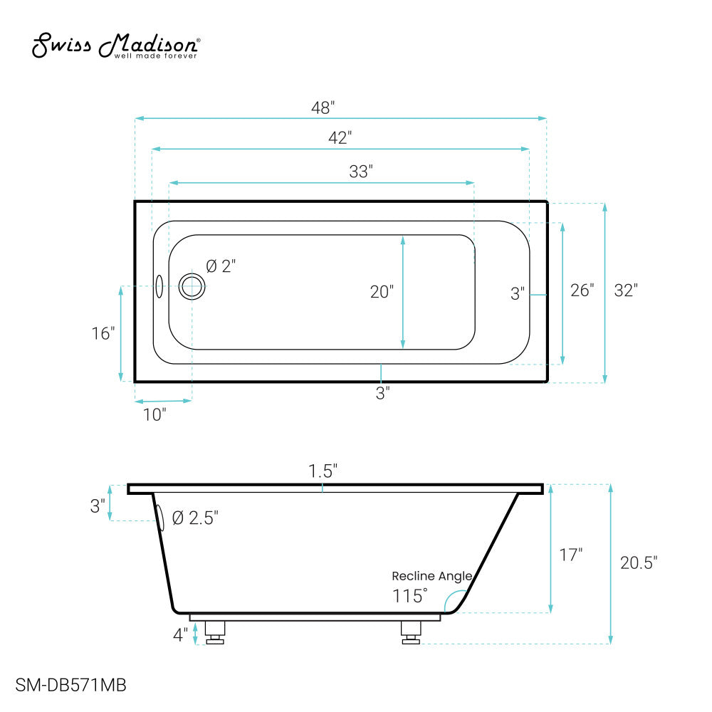 Swiss Madison Voltaire 48" x 32" Reversible Drain Drop-In Bathtub in Matte Black