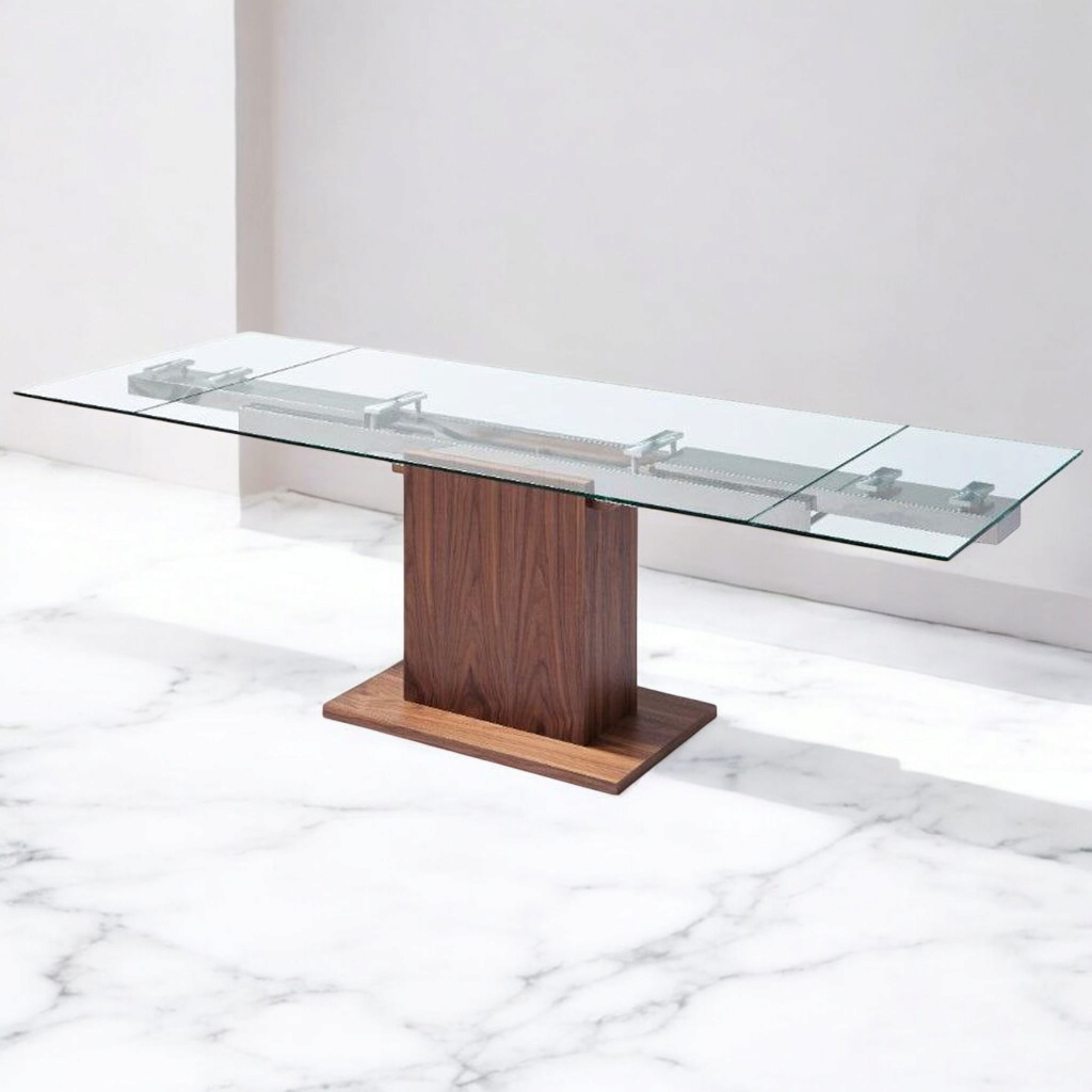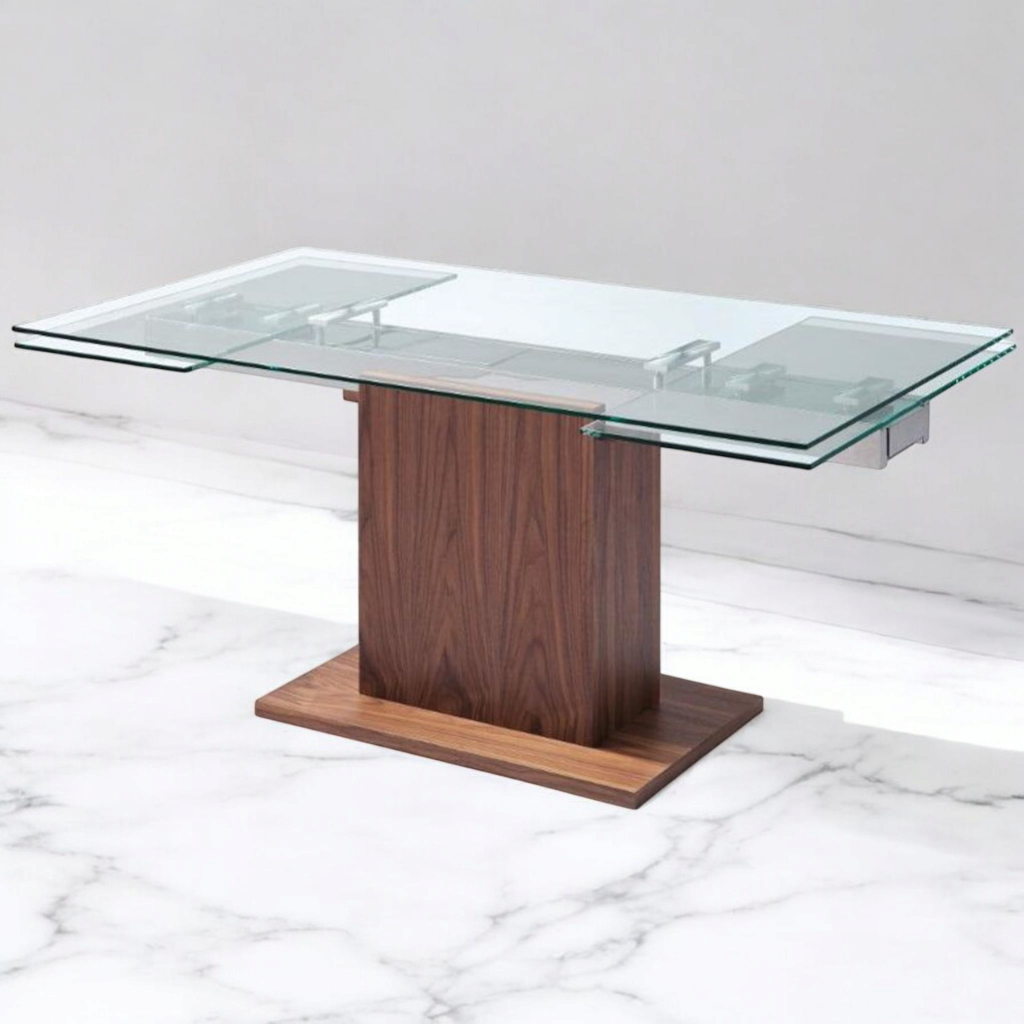 The rich walnut pedestal pairs warmth with modern minimalism, while a concealed stainless-steel frame keeps the ½-inch tempered glass rock steady for years of brunches, homework sessions, and holiday spreads.