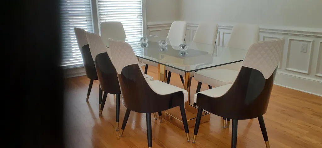 Whether it's an intimate dinner for two or a family feast, this dapper dining table effortlessly accommodates your needs. With ample space to comfortably seat up to eight, you can gather your loved ones in style, creating cherished memories around this exquisite piece.